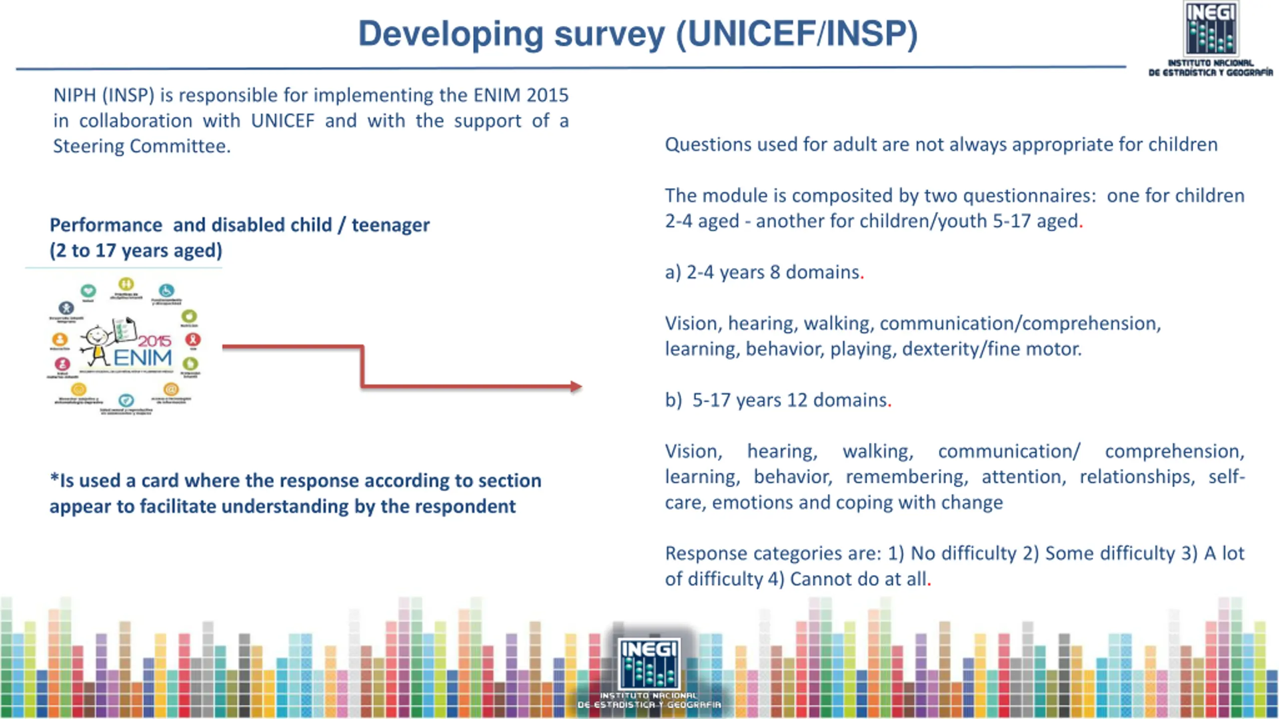 Developing survey (UNICEF/INSP) NIPH (INSP) is responsible for implementing the ENIM 2015 in collaboration with UNICEF and with the support of a Steering Committee. Questions used for adult are not always appropriate for children The module is composited by two questionnaires: one for children 2-4 aged - another for children/youth 5-17 aged. Performance and disabled child / teenager (2 to 17 years aged) a) 2-4 years 8 domains. Vision, hearing, walking, communication/comprehension, learning, behavior, playing, dexterity/fine motor. b) 5-17 years 12 domains. Vision, learning, behavior, remembering, attention, relationships, self- care, emotions and coping with change hearing, walking, communication/ comprehension, *Is used a card where the response according to section appear to facilitate understanding by the respondent Response categories are: 1) No difficulty 2) Some difficulty 3) A lot of difficulty 4) Cannot do at all.