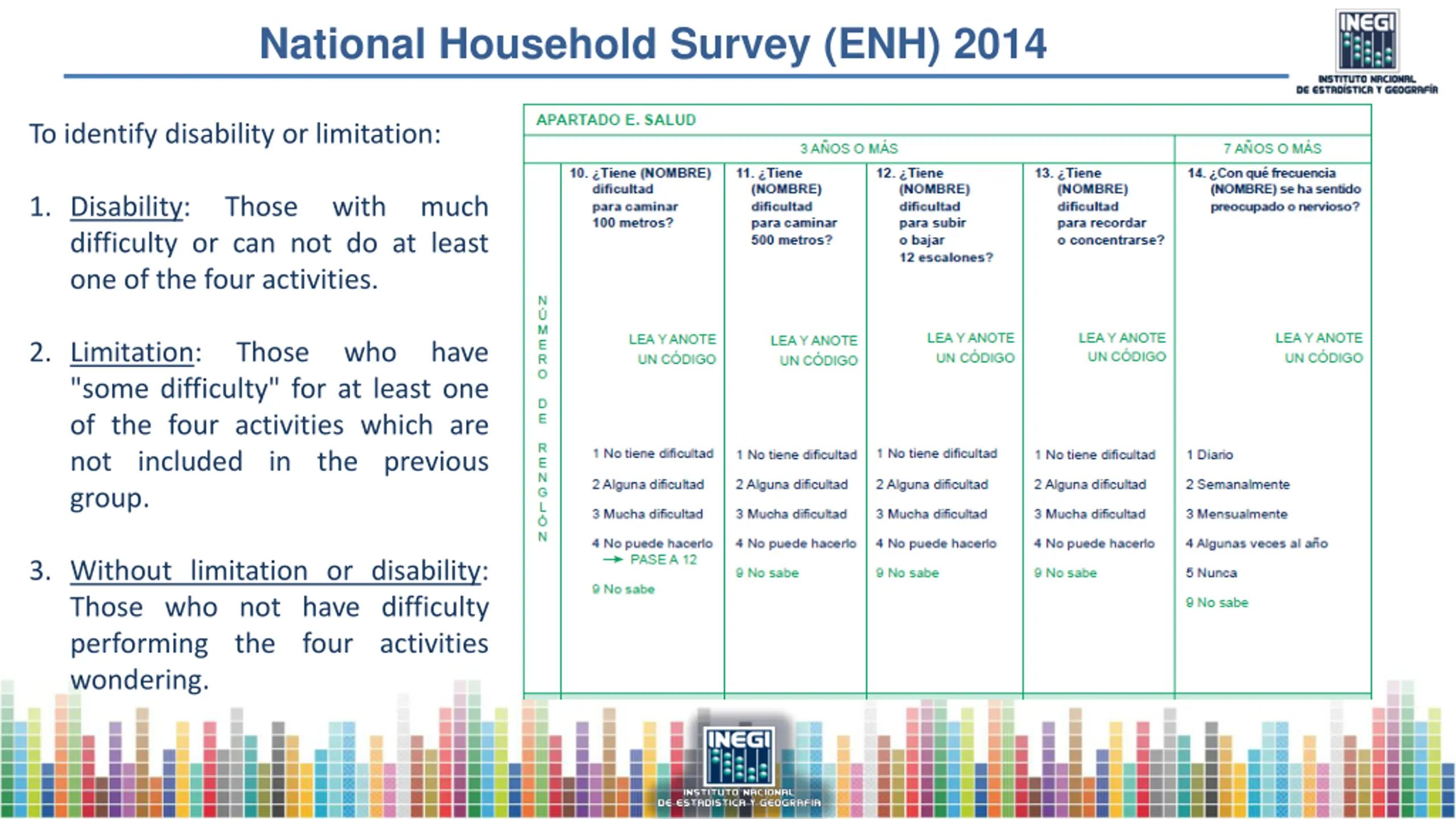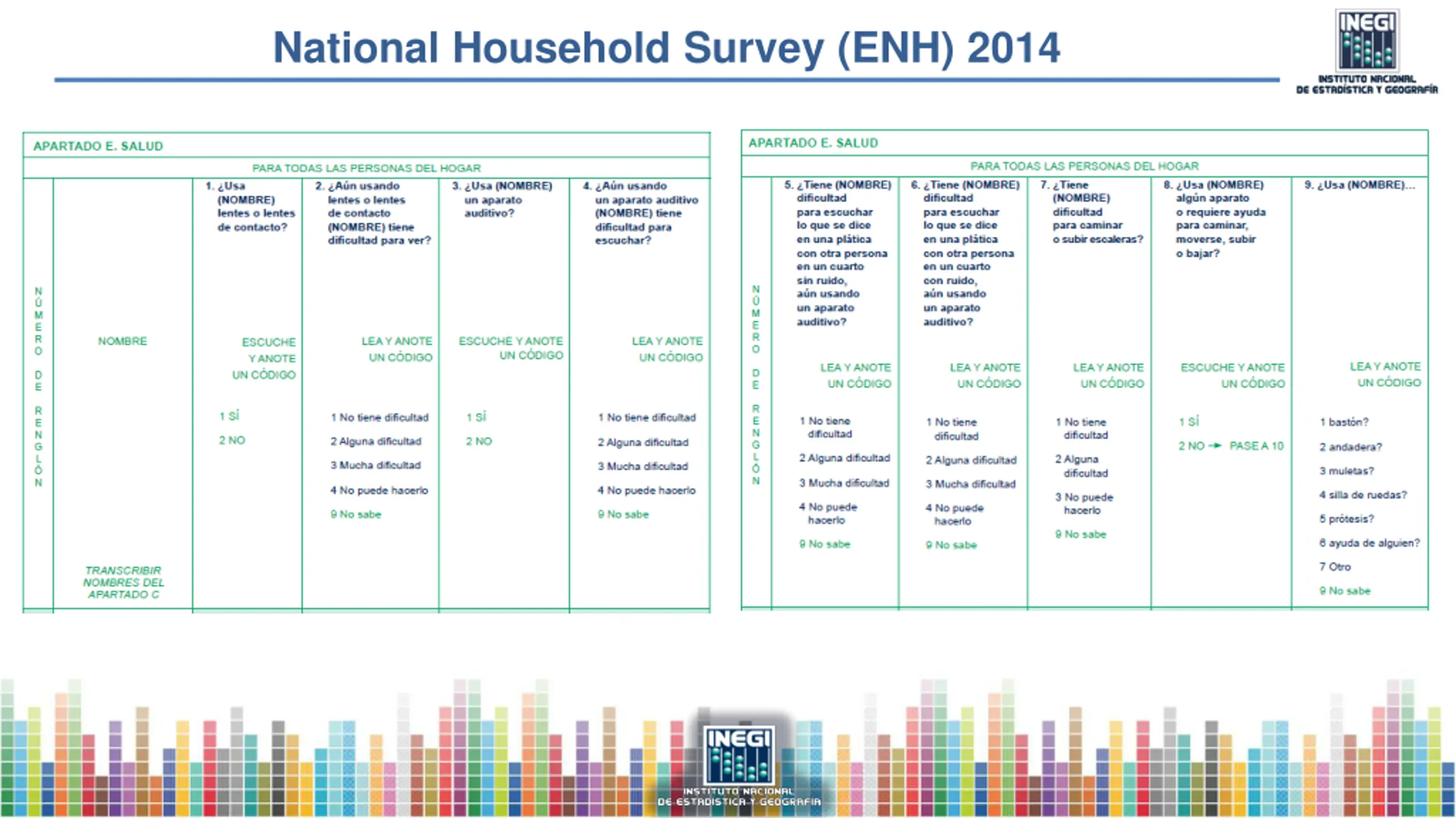Sources of information since 2010 Name Periodicity identifies Approach Representativity Daily life activities 1. Caminar, moverse, subir o bajar; 2. Ver, a n usando lentes; 3. Hablar, comunicarse o conversar 4. O r, usando aparato auditivo 5. Vestirse, ba arse o comer; 6. Poner atenci n o aprender cosas sencillas; 7. Tiene alguna limitaci n f sica o mental. Short form: National, State, municipality,locality 10 years Short and long ampliado Population and Housing Census 2010 WG Disability (no qualifiers) Long form: National, State, municipality and 14 locality sizes 1. Caminar, moverse, subir o bajar; 2. Ver, a n usando lentes; 3. Hablar, comunicarse o conversar 4. O r, usando aparato auditivo 5. Vestirse, ba arse o comer; 6. Poner atenci n o aprender cosas sencillas; 7. Tiene alguna limitaci n f sica o mental. National Survey of Mexican Household Income and Expenditures 2014 Every two years Sample size 21 427 Housing WG National; urban (>= 2 500) and rural (<= 2 499) areas Disability (no qualifiers) 1. Ver, a n usando lentes 2. Escuchar, a n usando aparato auditivo 3. Caminar o subir escaleras 4. Recordar o concentrarse National Household Survey 2014 Annual Sample size 64 000 housing Disability o limitation WG, Budapest Conference National; urban (>= 2 500) and rural (<= 2 499) areas 1. Caminar, subir o bajar usando sus piernas; 2. Ver (aunque use lentes); 3. Mover o usar sus brazos o manos; 4. Aprender, recordar o concentrarse; 5. Escuchar (aunque use aparato auditivo) 6. Ba arse, vestirse o comer; 7. Hablar o comunicarse; 8. Por problemas emocionales o mentales, Cu nta dificultad tiene (NOMBRE) para realizar sus actividades diarias? National Survey of Demographic Dynamics 2014 Every five years Sample size 101 000 housing Disability o limitation National, state y four locality sizes WG