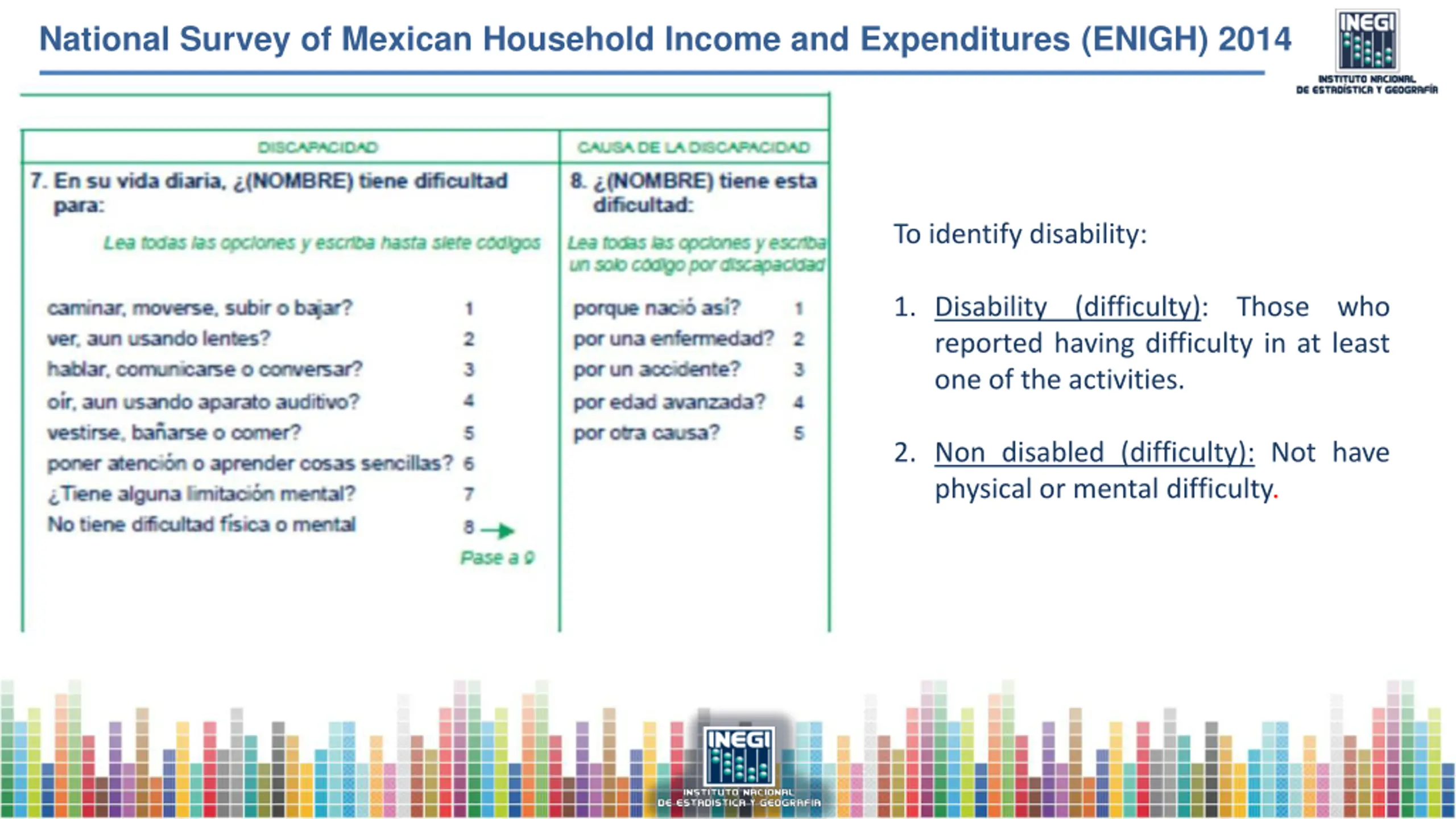 National Survey of Mexican Household Income and Expenditures (ENIGH) 2014 To identify disability: 1. Disability (difficulty): Those who reported having difficulty in at least one of the activities. 2. Non disabled (difficulty): Not have physical or mental difficulty.