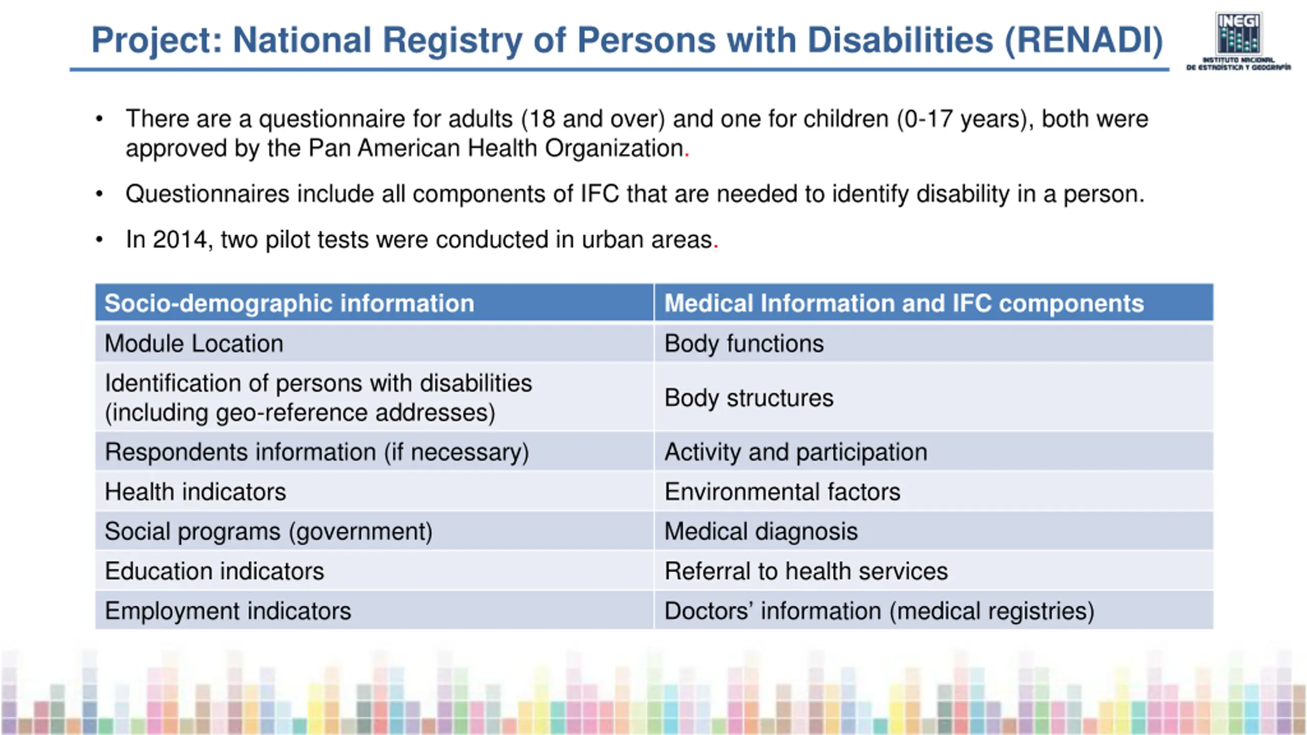 Project: National Registry of Persons with Disabilities (RENADI) There are a questionnaire for adults (18 and over) and one for children (0-17 years), both were approved by the Pan American Health Organization. Questionnaires include all components of IFC that are needed to identify disability in a person. In 2014, two pilot tests were conducted in urban areas. Socio-demographic information Module Location Identification of persons with disabilities (including geo-reference addresses) Respondents information (if necessary) Health indicators Social programs (government) Education indicators Employment indicators Medical Information and IFC components Body functions Body structures Activity and participation Environmental factors Medical diagnosis Referral to health services Doctors information (medical registries)