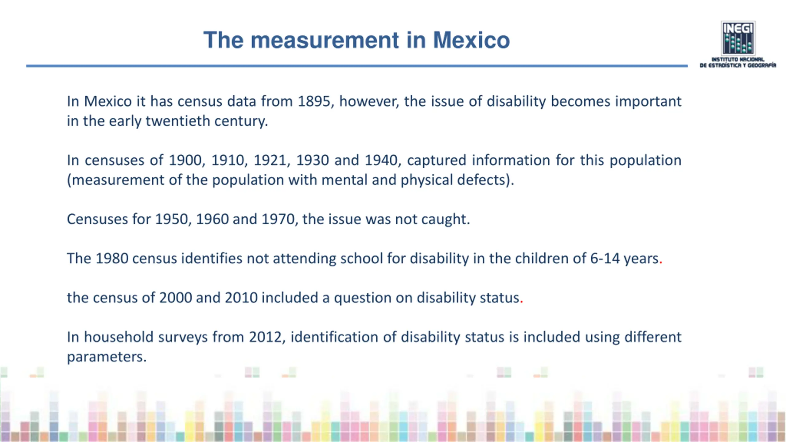 The measurement in Mexico In Mexico it has census data from 1895, however, the issue of disability becomes important in the early twentieth century. In censuses of 1900, 1910, 1921, 1930 and 1940, captured information for this population (measurement of the population with mental and physical defects). Censuses for 1950, 1960 and 1970, the issue was not caught. The 1980 census identifies not attending school for disability in the children of 6-14 years. the census of 2000 and 2010 included a question on disability status. In household surveys from 2012, identification of disability status is included using different parameters.