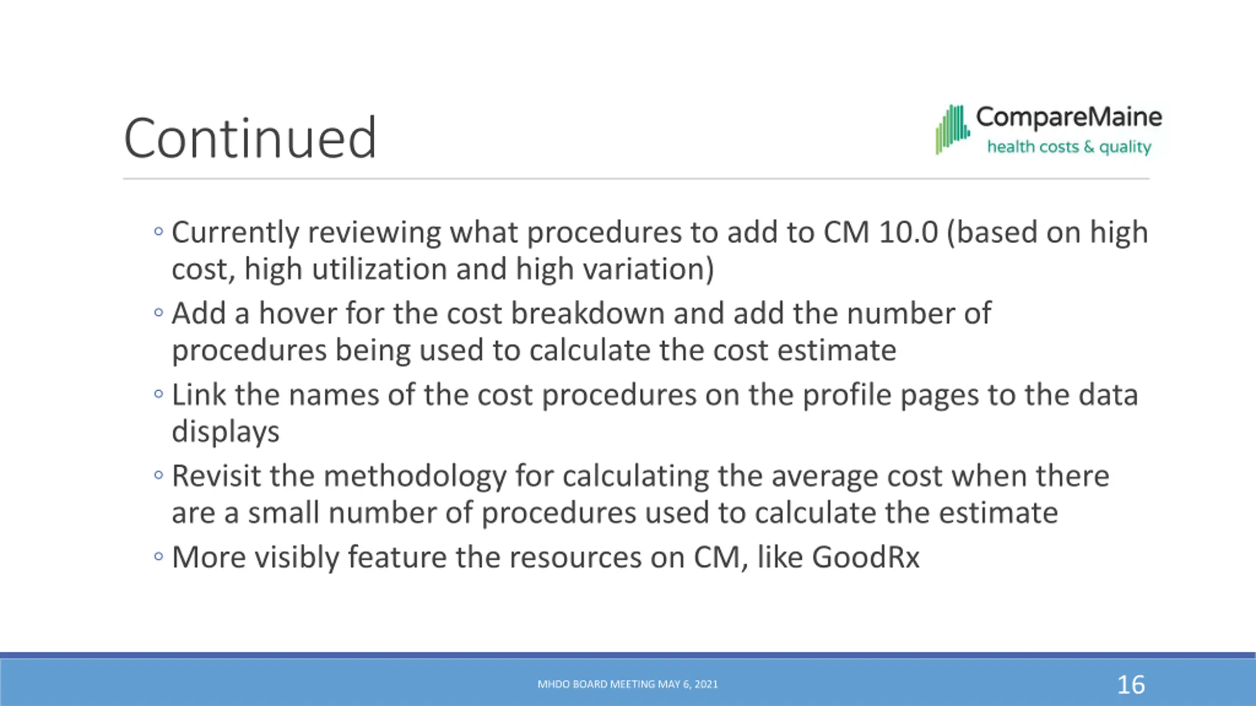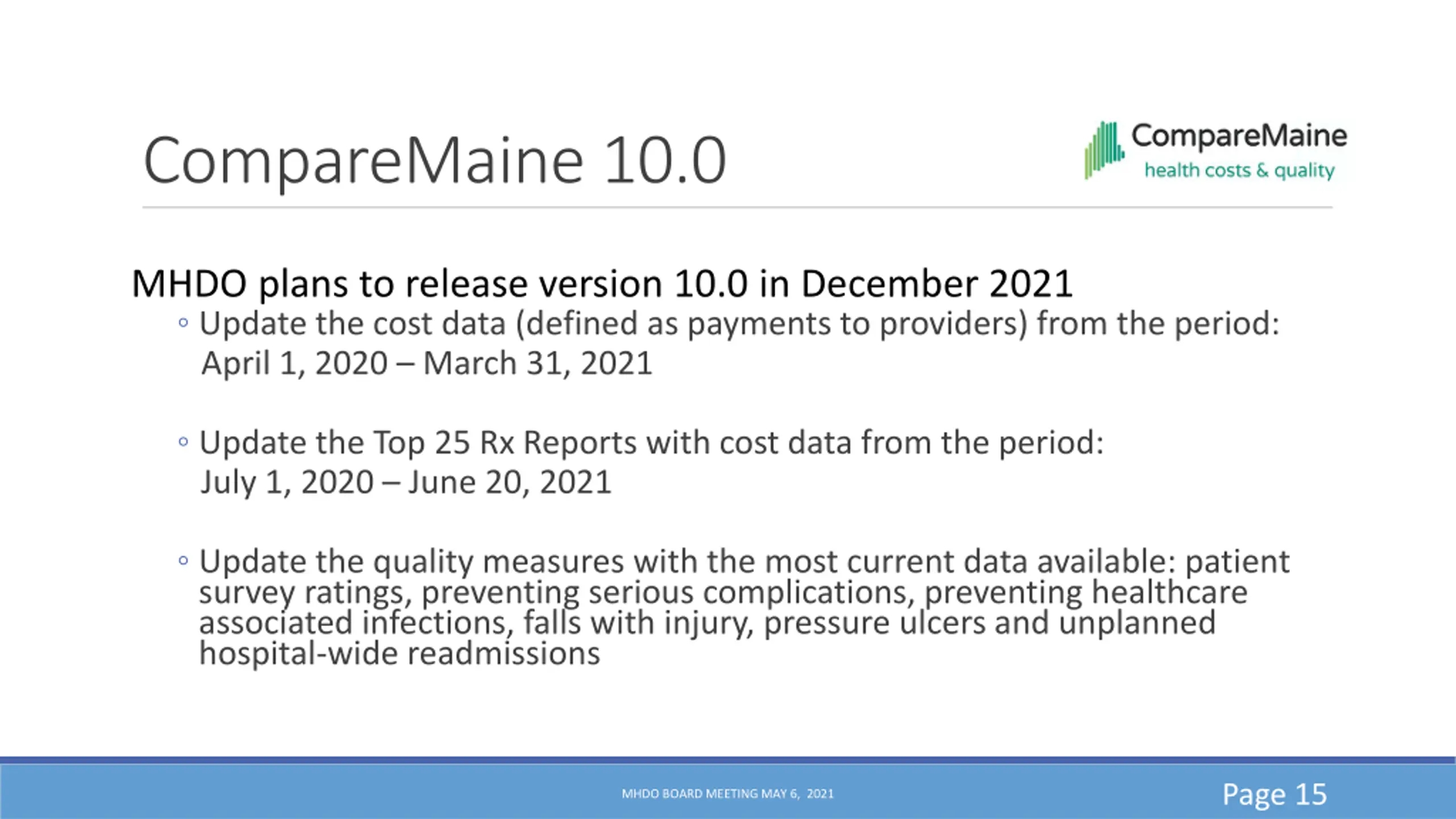 CompareMaine 10.0 MHDO plans to release version 10.0 in December 2021 Update the cost data (defined as payments to providers) from the period: April 1, 2020 March 31, 2021 Update the Top 25 Rx Reports with cost data from the period: July 1, 2020 June 20, 2021 Update the quality measures with the most current data available: patient survey ratings, preventing serious complications, preventing healthcare associated infections, falls with injury, pressure ulcers and unplanned hospital-wide readmissions Page 15 MHDO BOARD MEETING MAY 6, 2021