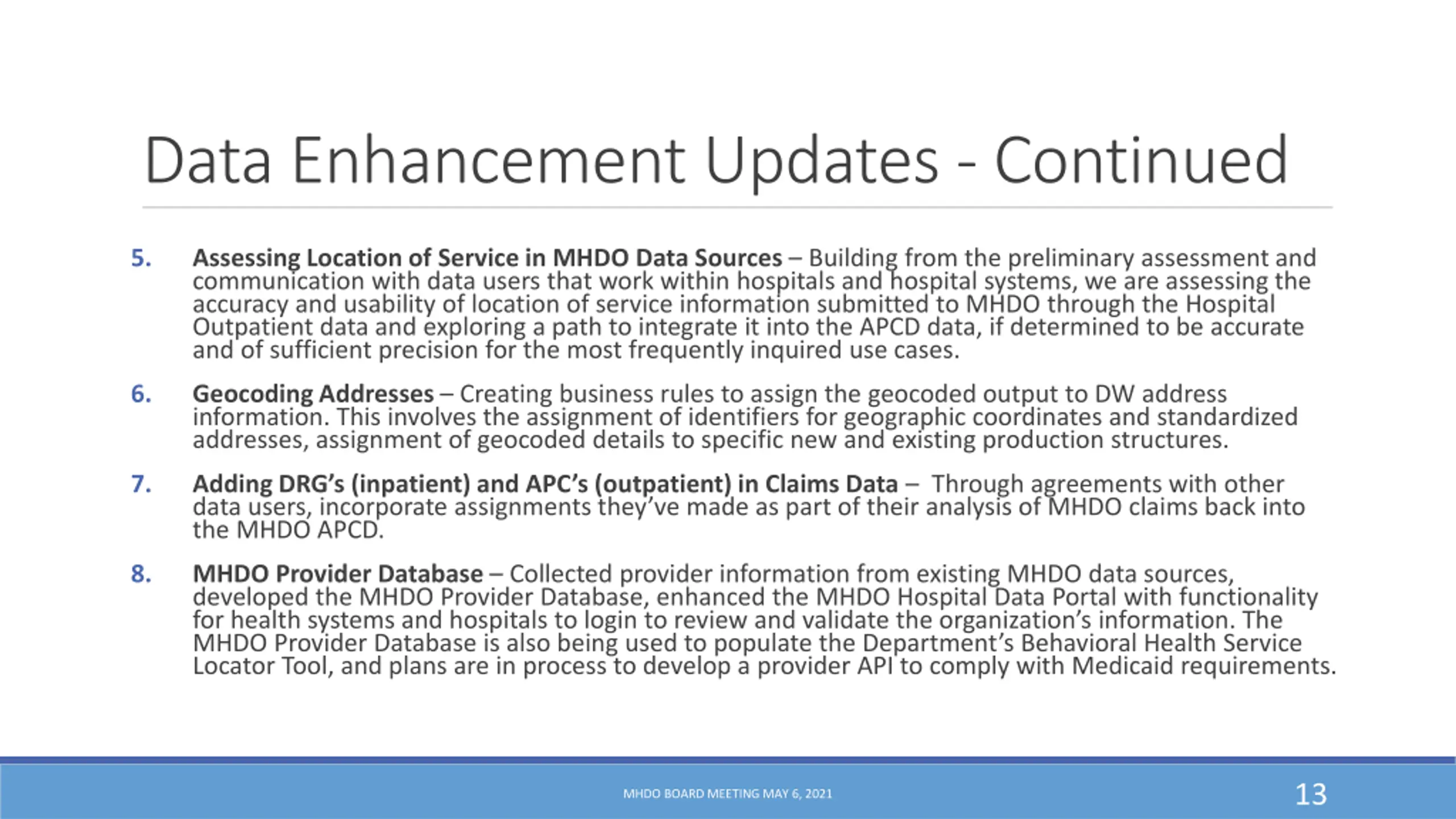 Data Enhancement Updates - Continued 5. Assessing Location of Service in MHDO Data Sources Building from the preliminary assessment and communication with data users that work within hospitals and hospital systems, we are assessing the accuracy and usability of location of service information submitted to MHDO through the Hospital Outpatient data and exploring a path to integrate it into the APCD data, if determined to be accurate and of sufficient precision for the most frequently inquired use cases. 6. Geocoding Addresses Creating business rules to assign the geocoded output to DW address information. This involves the assignment of identifiers for geographic coordinates and standardized addresses, assignment of geocoded details to specific new and existing production structures. 7. Adding DRG s (inpatient) and APC s (outpatient) in Claims Data Through agreements with other data users, incorporate assignments they ve made as part of their analysis of MHDO claims back into the MHDO APCD. 8. MHDO Provider Database Collected provider information from existing MHDO data sources, developed the MHDO Provider Database, enhanced the MHDO Hospital Data Portal with functionality for health systems and hospitals to login to review and validate the organization s information. The MHDO Provider Database is also being used to populate the Department s Behavioral Health Service Locator Tool, and plans are in process to develop a provider API to comply with Medicaid requirements. 13 MHDO BOARD MEETING MAY 6, 2021