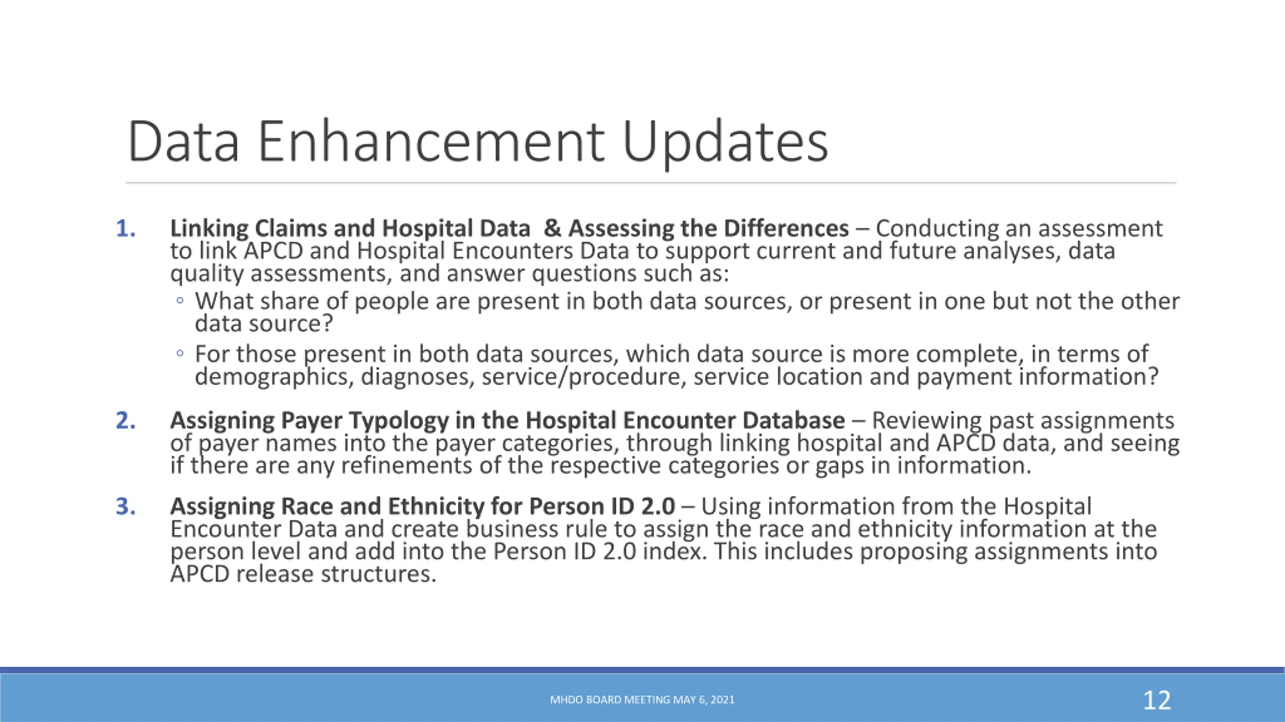 Data Enhancement Updates 1. Linking Claims and Hospital Data & Assessing the Differences Conducting an assessment to link APCD and Hospital Encounters Data to support current and future analyses, data quality assessments, and answer questions such as: What share of people are present in both data sources, or present in one but not the other data source? For those present in both data sources, which data source is more complete, in terms of demographics, diagnoses, service/procedure, service location and payment information? 2. Assigning Payer Typology in the Hospital Encounter Database Reviewing past assignments of payer names into the payer categories, through linking hospital and APCD data, and seeing if there are any refinements of the respective categories or gaps in information. 3. Assigning Race and Ethnicity for Person ID 2.0 Using information from the Hospital Encounter Data and create business rule to assign the race and ethnicity information at the person level and add into the Person ID 2.0 index. This includes proposing assignments into APCD release structures. 12 MHDO BOARD MEETING MAY 6, 2021