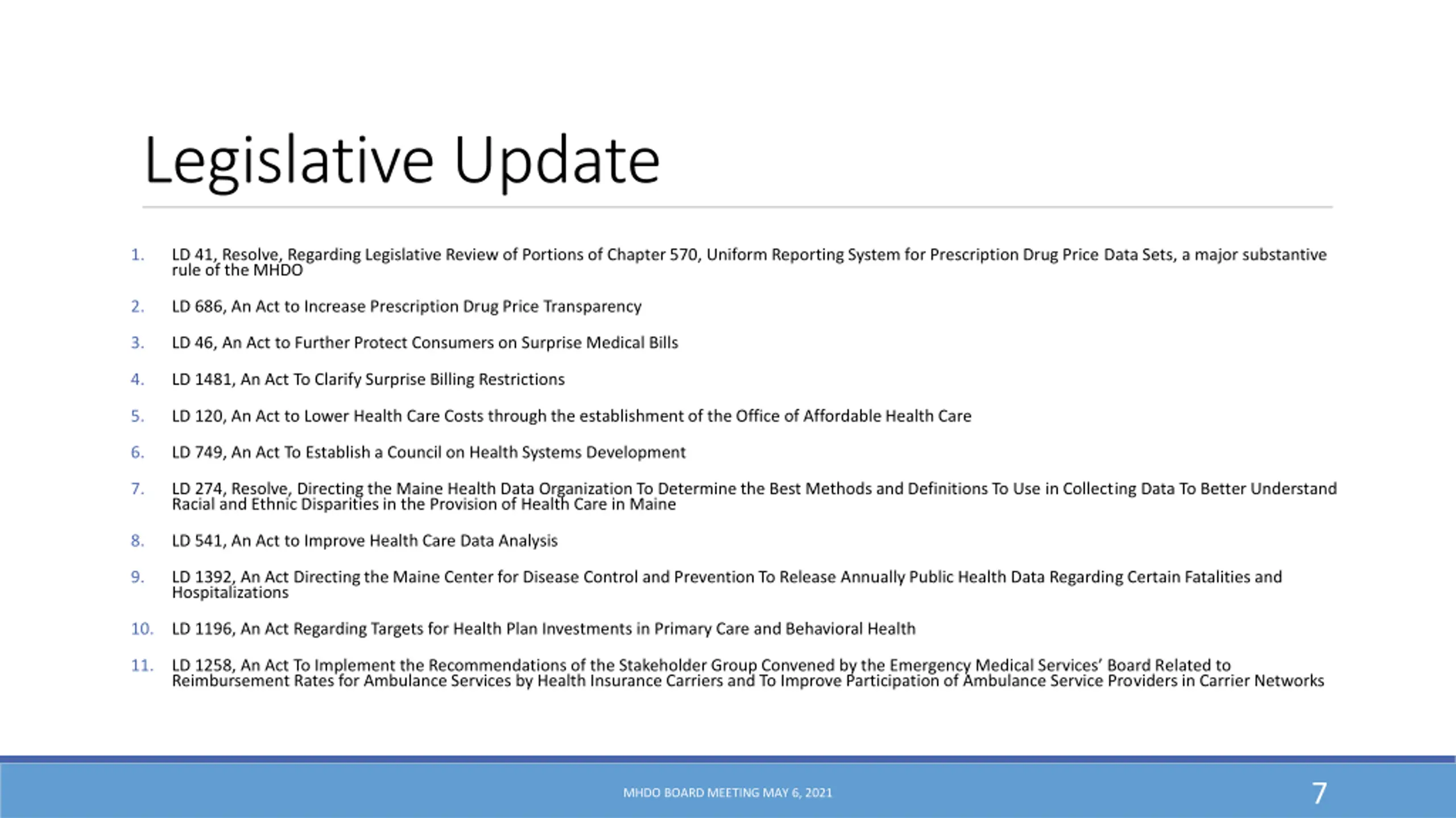 Legislative Update 1. LD 41, Resolve, Regarding Legislative Review of Portions of Chapter 570, Uniform Reporting System for Prescription Drug Price Data Sets, a major substantive rule of the MHDO 2. LD 686, An Act to Increase Prescription Drug Price Transparency 3. LD 46, An Act to Further Protect Consumers on Surprise Medical Bills 4. LD 1481, An Act To Clarify Surprise Billing Restrictions 5. LD 120, An Act to Lower Health Care Costs through the establishment of the Office of Affordable Health Care 6. LD 749, An Act To Establish a Council on Health Systems Development 7. LD 274, Resolve, Directing the Maine Health Data Organization To Determine the Best Methods and Definitions To Use in Collecting Data To Better Understand Racial and Ethnic Disparities in the Provision of Health Care in Maine 8. LD 541, An Act to Improve Health Care Data Analysis 9. LD 1392, An Act Directing the Maine Center for Disease Control and Prevention To Release Annually Public Health Data Regarding Certain Fatalities and Hospitalizations 10. LD 1196, An Act Regarding Targets for Health Plan Investments in Primary Care and Behavioral Health 11. LD 1258, An Act To Implement the Recommendations of the Stakeholder Group Convened by the Emergency Medical Services Board Related to Reimbursement Rates for Ambulance Services by Health Insurance Carriers and To Improve Participation of Ambulance Service Providers in Carrier Networks 7 MHDO BOARD MEETING MAY 6, 2021