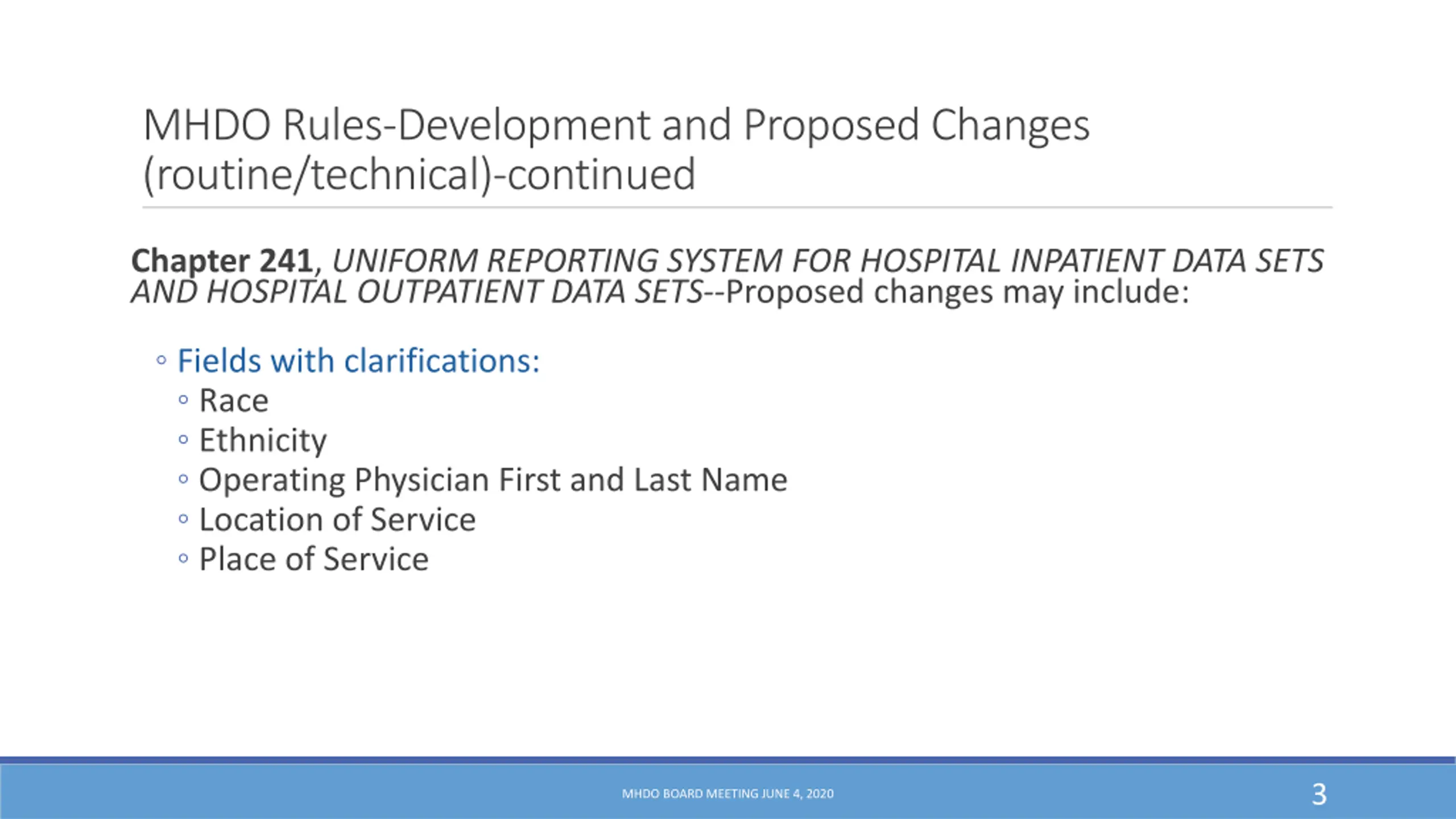 MHDO Rules-Development and Proposed Changes (routine/technical)-continued Chapter 241, UNIFORM REPORTING SYSTEM FOR HOSPITAL INPATIENT DATA SETS AND HOSPITAL OUTPATIENT DATA SETS--Proposed changes may include: Fields with clarifications: Race Ethnicity Operating Physician First and Last Name Location of Service Place of Service 3 MHDO BOARD MEETING JUNE 4, 2020