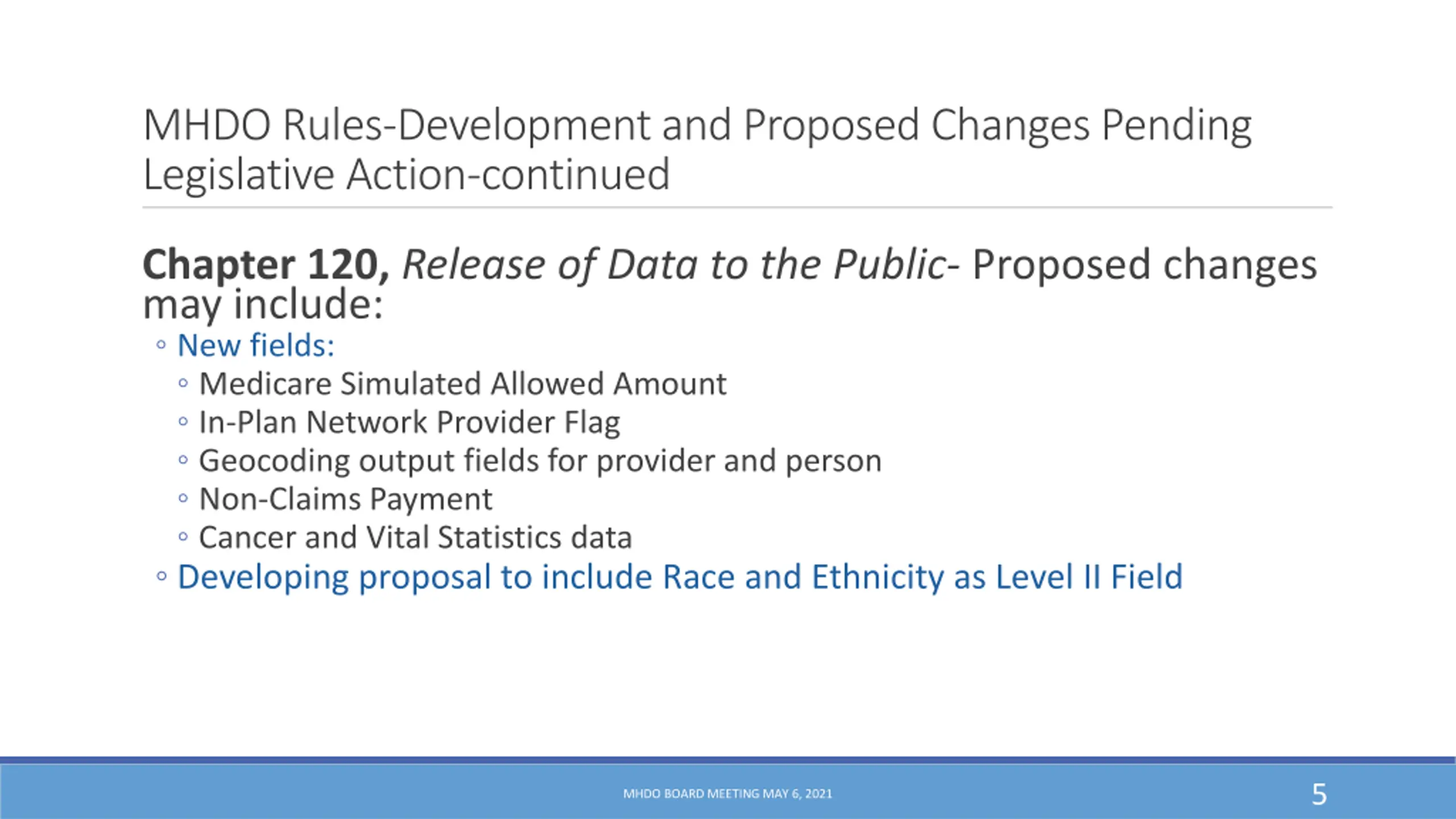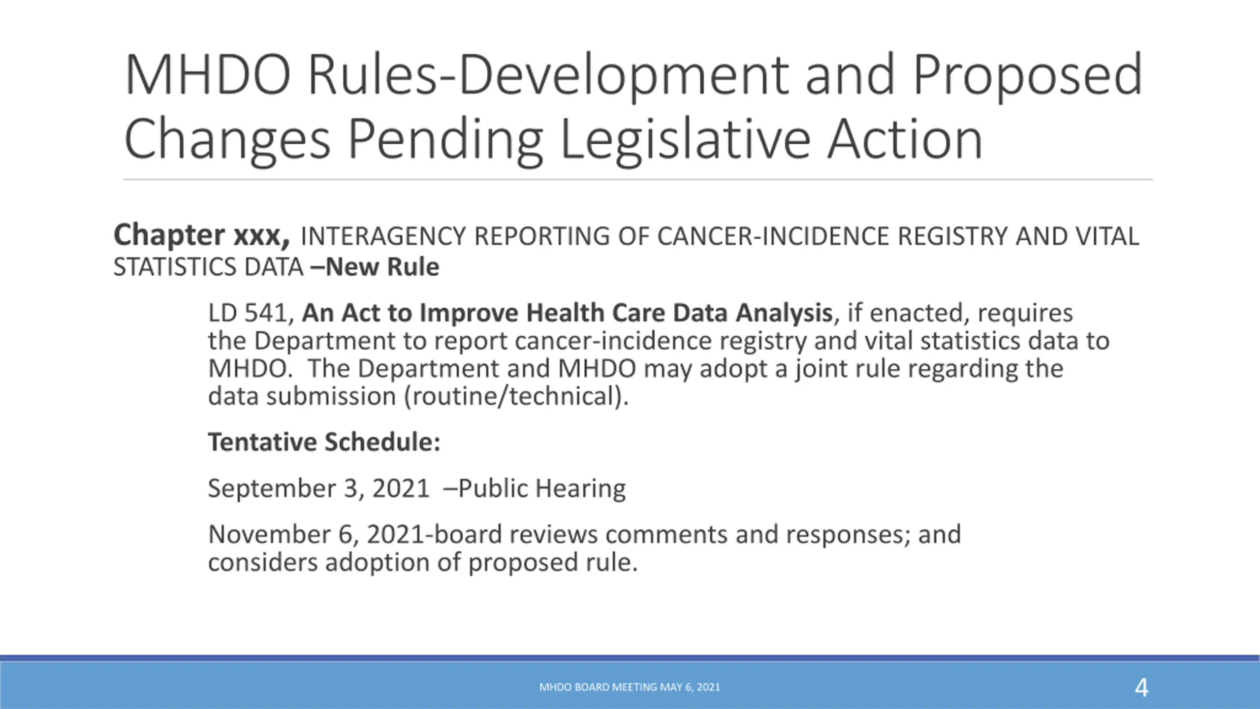 MHDO Rules-Development and Proposed Changes Pending Legislative Action Chapter xxx, INTERAGENCY REPORTING OF CANCER-INCIDENCE REGISTRY AND VITAL STATISTICS DATA New Rule LD 541, An Act to Improve Health Care Data Analysis, if enacted, requires the Department to report cancer-incidence registry and vital statistics data to MHDO. The Department and MHDO may adopt a joint rule regarding the data submission (routine/technical). Tentative Schedule: September 3, 2021 Public Hearing November 6, 2021-board reviews comments and responses; and considers adoption of proposed rule. 4 MHDO BOARD MEETING MAY 6, 2021