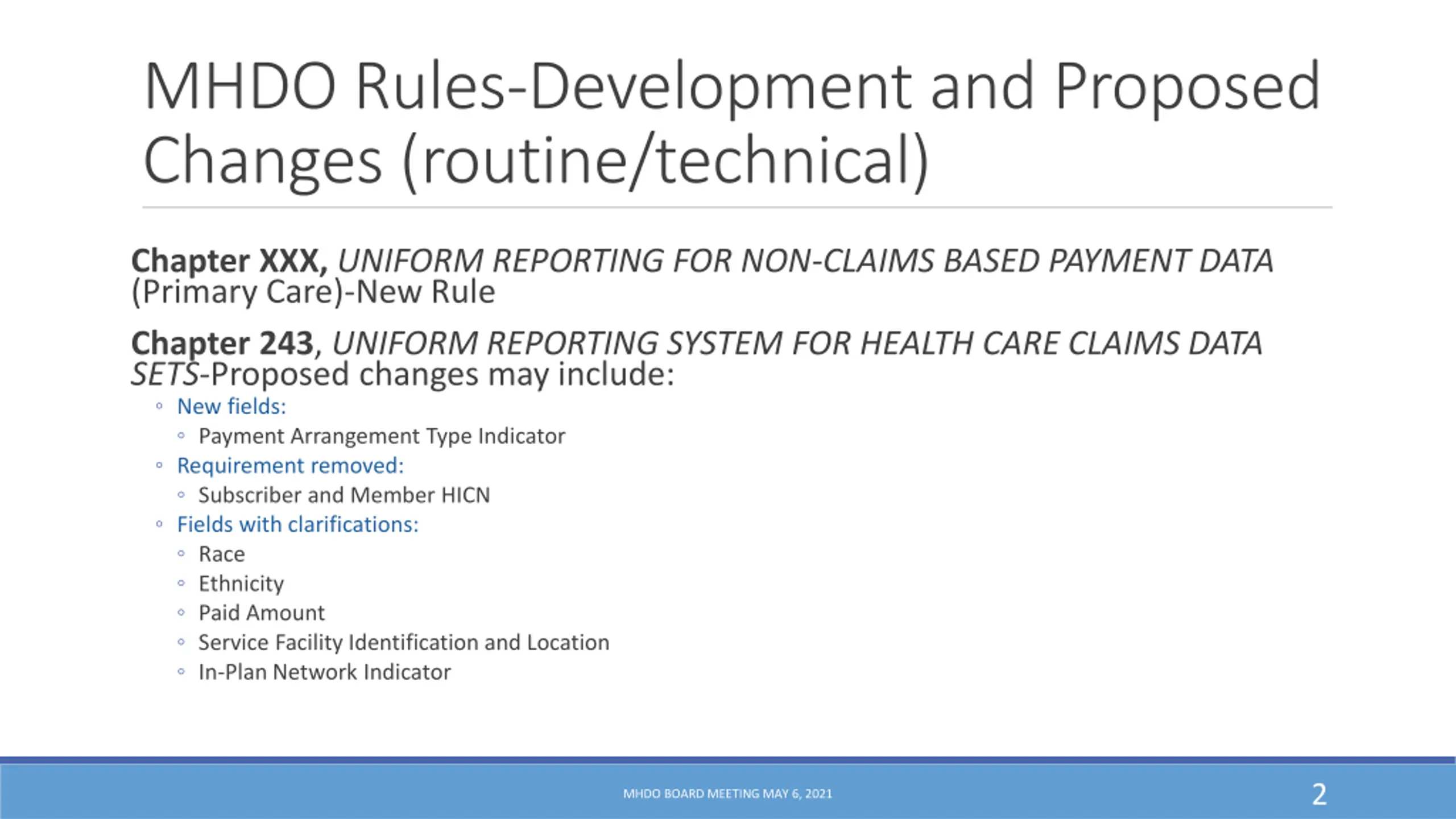 MHDO Rules-Development and Proposed Changes (routine/technical) Chapter XXX, UNIFORM REPORTING FOR NON-CLAIMS BASED PAYMENT DATA (Primary Care)-New Rule Chapter 243, UNIFORM REPORTING SYSTEM FOR HEALTH CARE CLAIMS DATA SETS-Proposed changes may include: New fields: Payment Arrangement Type Indicator Requirement removed: Subscriber and Member HICN Fields with clarifications: Race Ethnicity Paid Amount Service Facility Identification and Location In-Plan Network Indicator 2 MHDO BOARD MEETING MAY 6, 2021