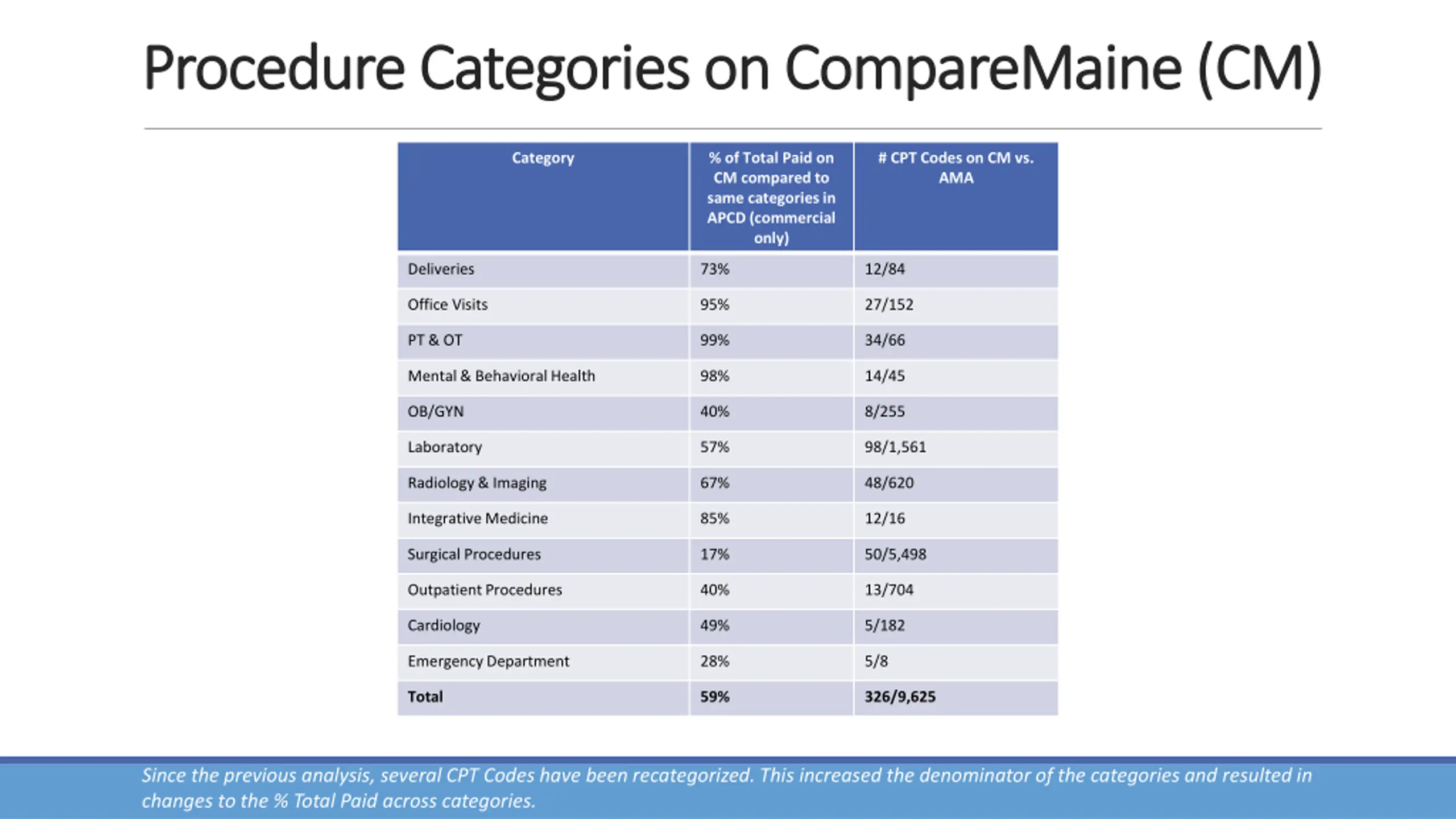 Procedure Categories on CompareMaine (CM) Procedure Categories on CompareMaine (CM) Category % of Total Paid on CM compared to same categories in APCD (commercial only) # CPT Codes on CM vs. AMA Deliveries 73% 12/84 Office Visits 95% 27/152 PT & OT 99% 34/66 Mental & Behavioral Health 98% 14/45 OB/GYN 40% 8/255 Laboratory 57% 98/1,561 Radiology & Imaging 67% 48/620 Integrative Medicine 85% 12/16 Surgical Procedures 17% 50/5,498 Outpatient Procedures 40% 13/704 Cardiology 49% 5/182 Emergency Department 28% 5/8 Total 59% 326/9,625 Since the previous analysis, several CPT Codes have been recategorized. This increased the denominator of the categories and resulted in changes to the % Total Paid across categories.