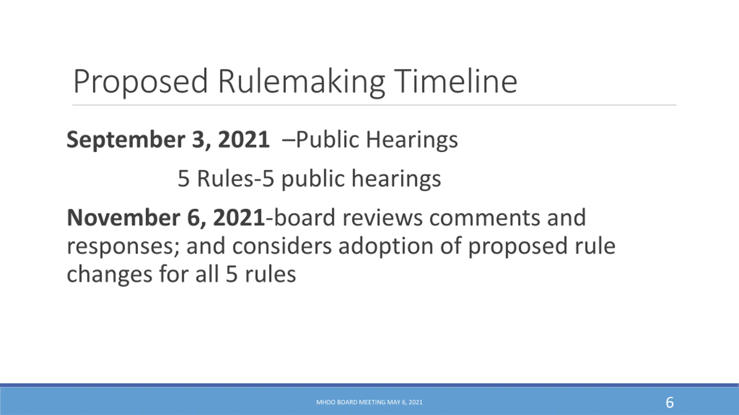 Proposed Rulemaking Timeline September 3, 2021 Public Hearings 5 Rules-5 public hearings November 6, 2021-board reviews comments and responses; and considers adoption of proposed rule changes for all 5 rules 6 MHDO BOARD MEETING MAY 6, 2021
