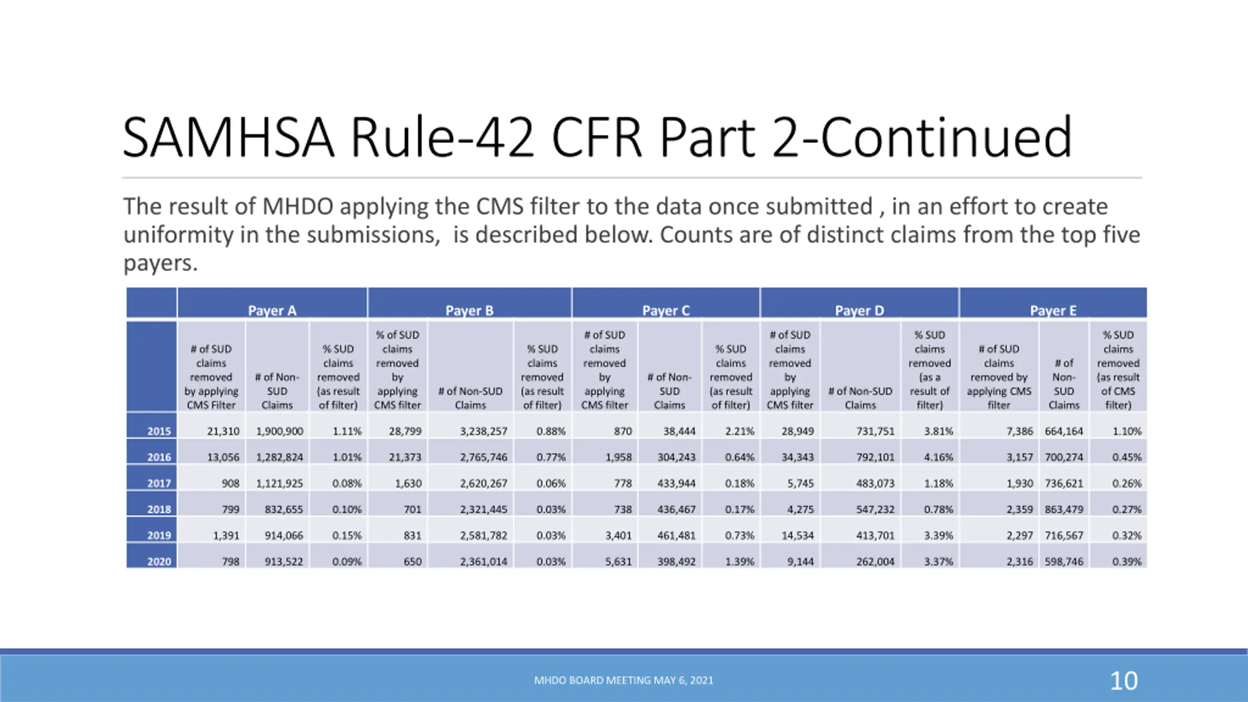 SAMHSA Rule-42 CFR Part 2-Continued The result of MHDO applying the CMS filter to the data once submitted , in an effort to create uniformity in the submissions, is described below. Counts are of distinct claims from the top five payers. Payer A Payer B Payer C Payer D Payer E % of SUD claims removed by applying CMS filter # of SUD claims removed by applying CMS filter # of SUD claims removed by applying CMS filter % SUD claims removed (as a result of filter) % SUD claims removed (as result of CMS filter) # of SUD claims removed by applying CMS Filter % SUD claims removed (as result of filter) % SUD claims removed (as result of filter) % SUD claims removed (as result of filter) # of SUD claims removed by applying CMS filter # of Non- SUD Claims # of Non- SUD Claims # of Non- SUD Claims # of Non-SUD Claims # of Non-SUD Claims 2015 21,310 1,900,900 1.11% 28,799 3,238,257 0.88% 870 38,444 2.21% 28,949 731,751 3.81% 7,386 664,164 1.10% 2016 13,056 1,282,824 1.01% 21,373 2,765,746 0.77% 1,958 304,243 0.64% 34,343 792,101 4.16% 3,157 700,274 0.45% 2017 908 1,121,925 0.08% 1,630 2,620,267 0.06% 778 433,944 0.18% 5,745 483,073 1.18% 1,930 736,621 0.26% 2018 799 832,655 0.10% 701 2,321,445 0.03% 738 436,467 0.17% 4,275 547,232 0.78% 2,359 863,479 0.27% 2019 1,391 914,066 0.15% 831 2,581,782 0.03% 3,401 461,481 0.73% 14,534 413,701 3.39% 2,297 716,567 0.32% 2020 798 913,522 0.09% 650 2,361,014 0.03% 5,631 398,492 1.39% 9,144 262,004 3.37% 2,316 598,746 0.39% 10 MHDO BOARD MEETING MAY 6, 2021