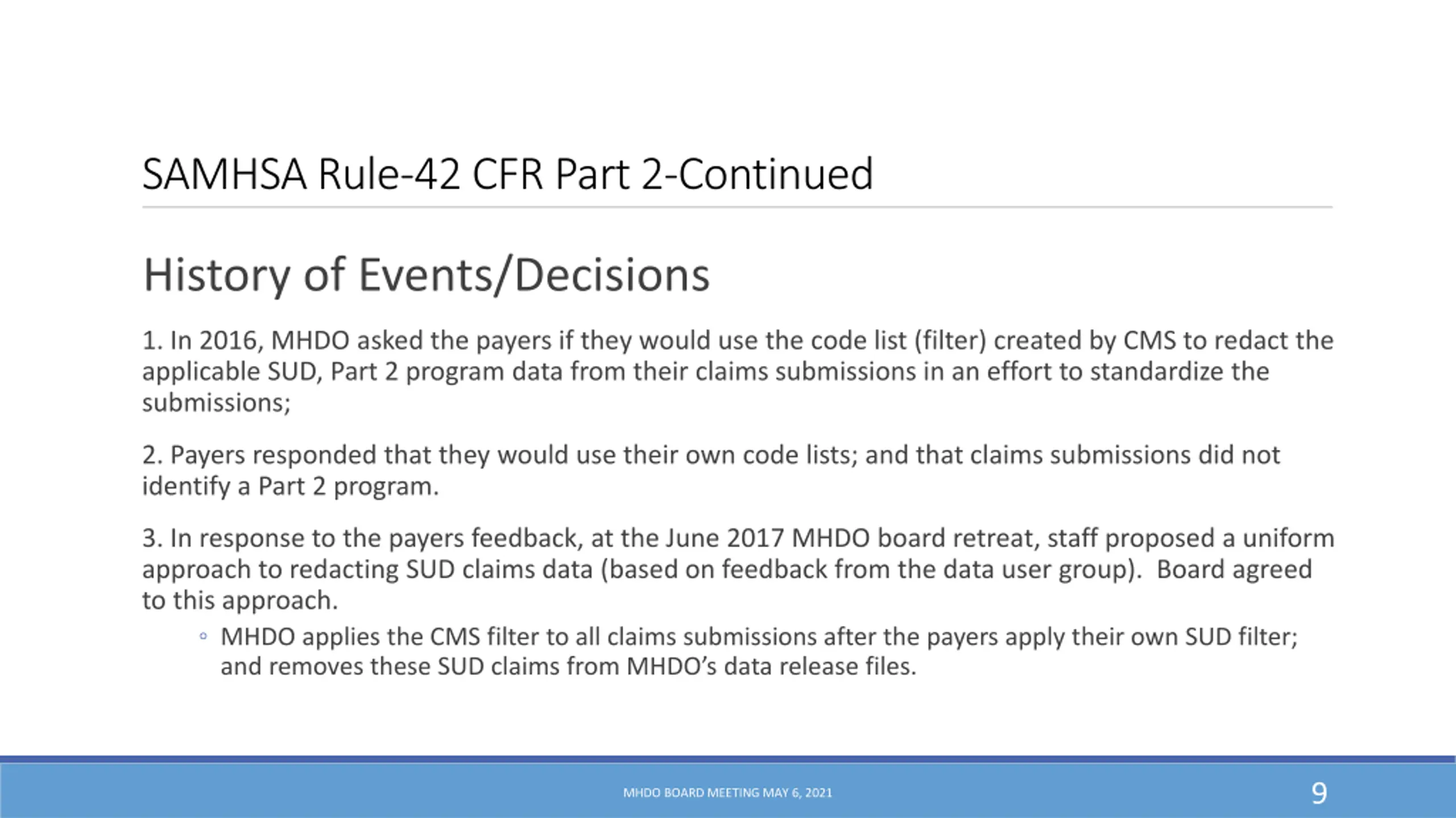 SAMHSA Rule-42 CFR Part 2-Continued History of Events/Decisions 1. In 2016, MHDO asked the payers if they would use the code list (filter) created by CMS to redact the applicable SUD, Part 2 program data from their claims submissions in an effort to standardize the submissions; 2. Payers responded that they would use their own code lists; and that claims submissions did not identify a Part 2 program. 3. In response to the payers feedback, at the June 2017 MHDO board retreat, staff proposed a uniform approach to redacting SUD claims data (based on feedback from the data user group). Board agreed to this approach. MHDO applies the CMS filter to all claims submissions after the payers apply their own SUD filter; and removes these SUD claims from MHDO s data release files. 9 MHDO BOARD MEETING MAY 6, 2021
