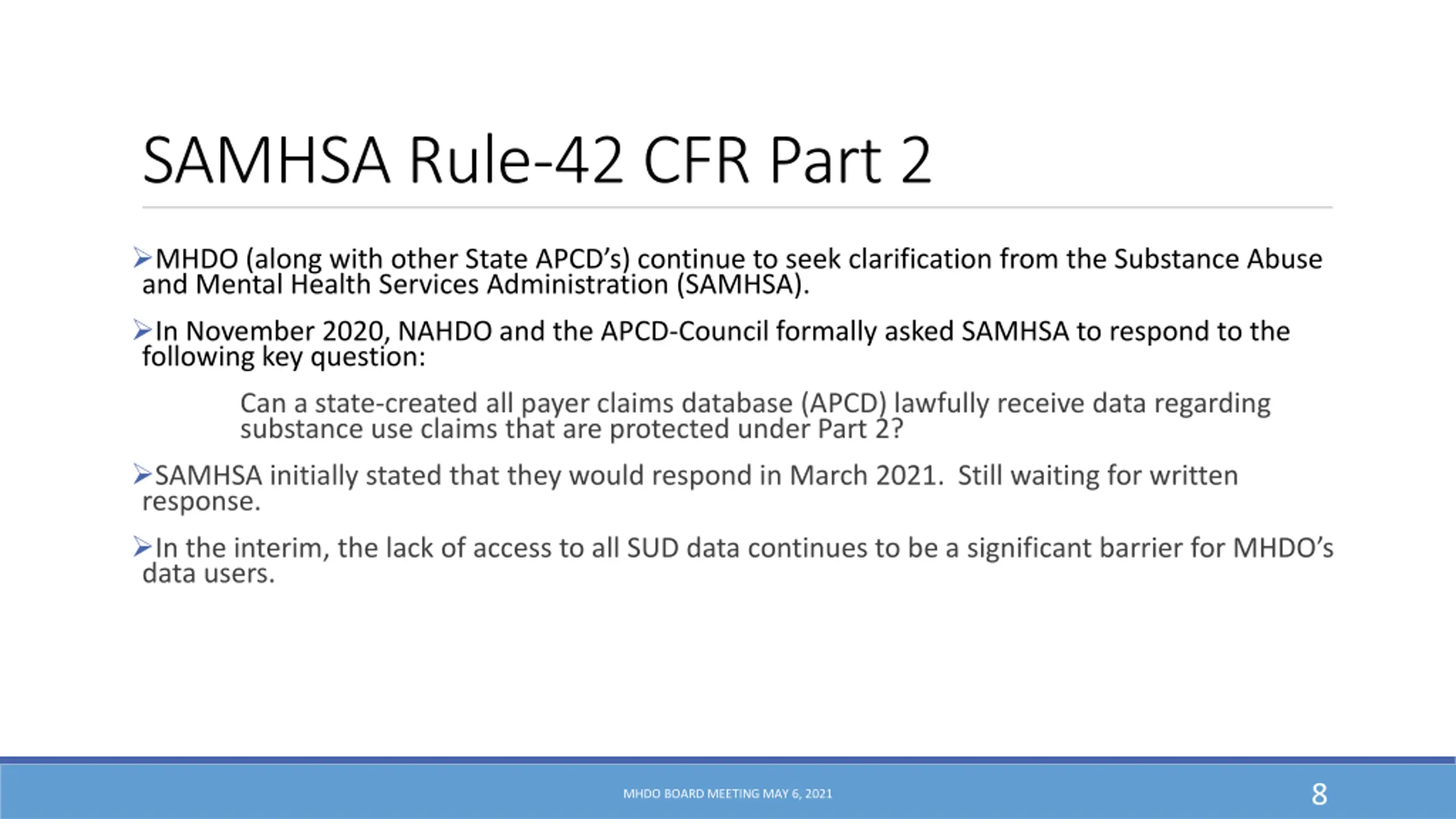 SAMHSA Rule-42 CFR Part 2 MHDO (along with other State APCD s) continue to seek clarification from the Substance Abuse and Mental Health Services Administration (SAMHSA). In November 2020, NAHDO and the APCD-Council formally asked SAMHSA to respond to the following key question: Can a state-created all payer claims database (APCD) lawfully receive data regarding substance use claims that are protected under Part 2? SAMHSA initially stated that they would respond in March 2021. Still waiting for written response. In the interim, the lack of access to all SUD data continues to be a significant barrier for MHDO s data users. 8 MHDO BOARD MEETING MAY 6, 2021