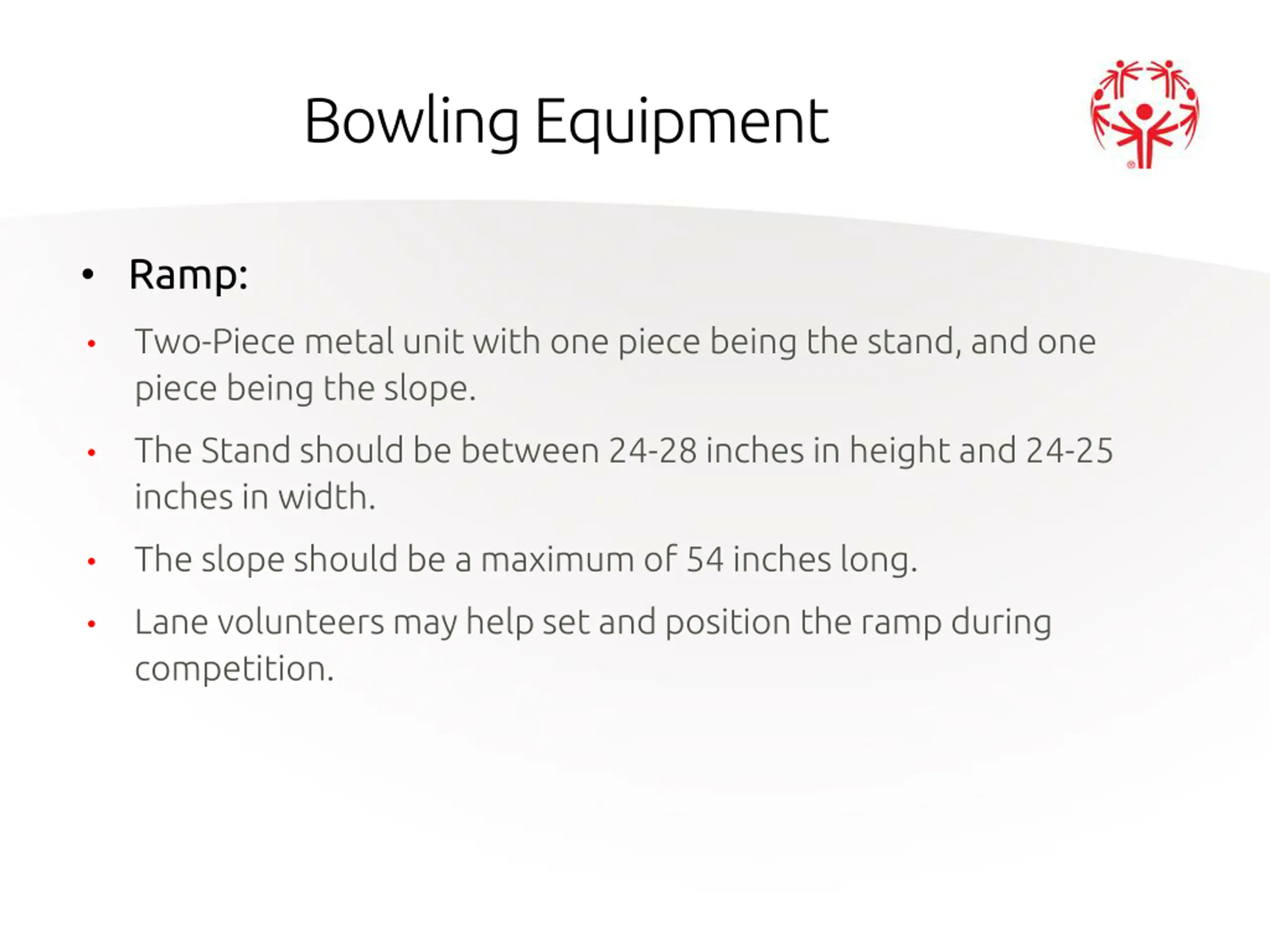 Bowling Equipment Ramp: Two-Piece metal unit with one piece being the stand, and one piece being the slope. The Stand should be between 24-28 inches in height and 24-25 inches in width. The slope should be a maximum of 54 inches long. Lane volunteers may help set and position the ramp during competition.