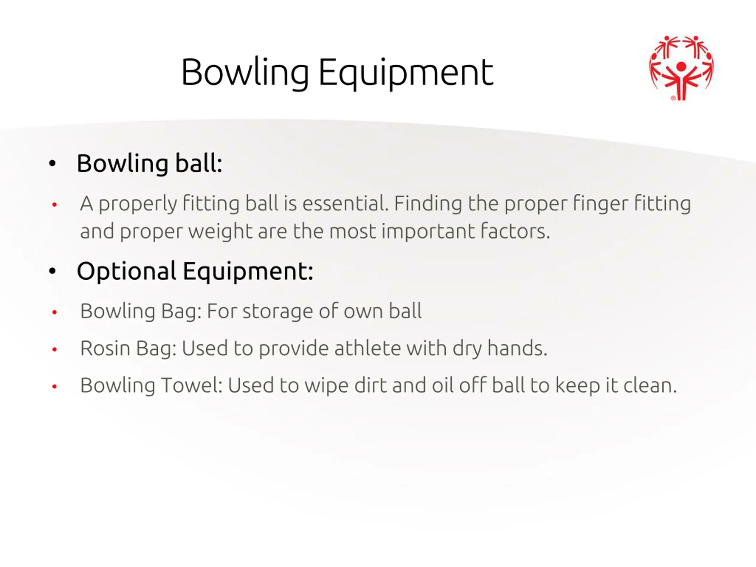 Bowling Equipment Bowling ball: A properly fitting ball is essential. Finding the proper finger fitting and proper weight are the most important factors. Optional Equipment: Bowling Bag: For storage of own ball Rosin Bag: Used to provide athlete with dry hands. Bowling Towel: Used to wipe dirt and oil off ball to keep it clean.