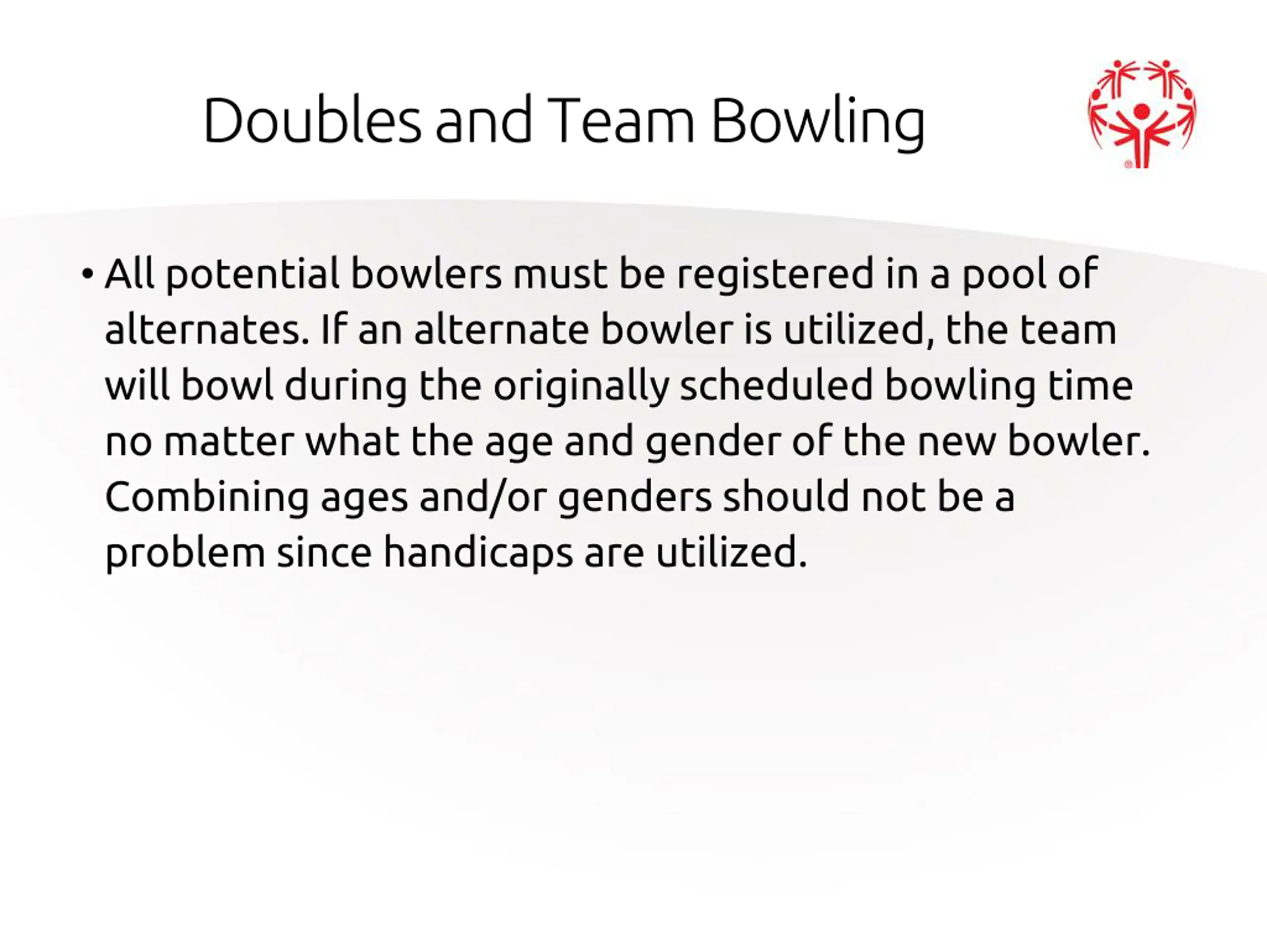 Doubles and Team Bowling All potential bowlers must be registered in a pool of alternates. If an alternate bowler is utilized, the team will bowl during the originally scheduled bowling time no matter what the age and gender of the new bowler. Combining ages and/or genders should not be a problem since handicaps are utilized.