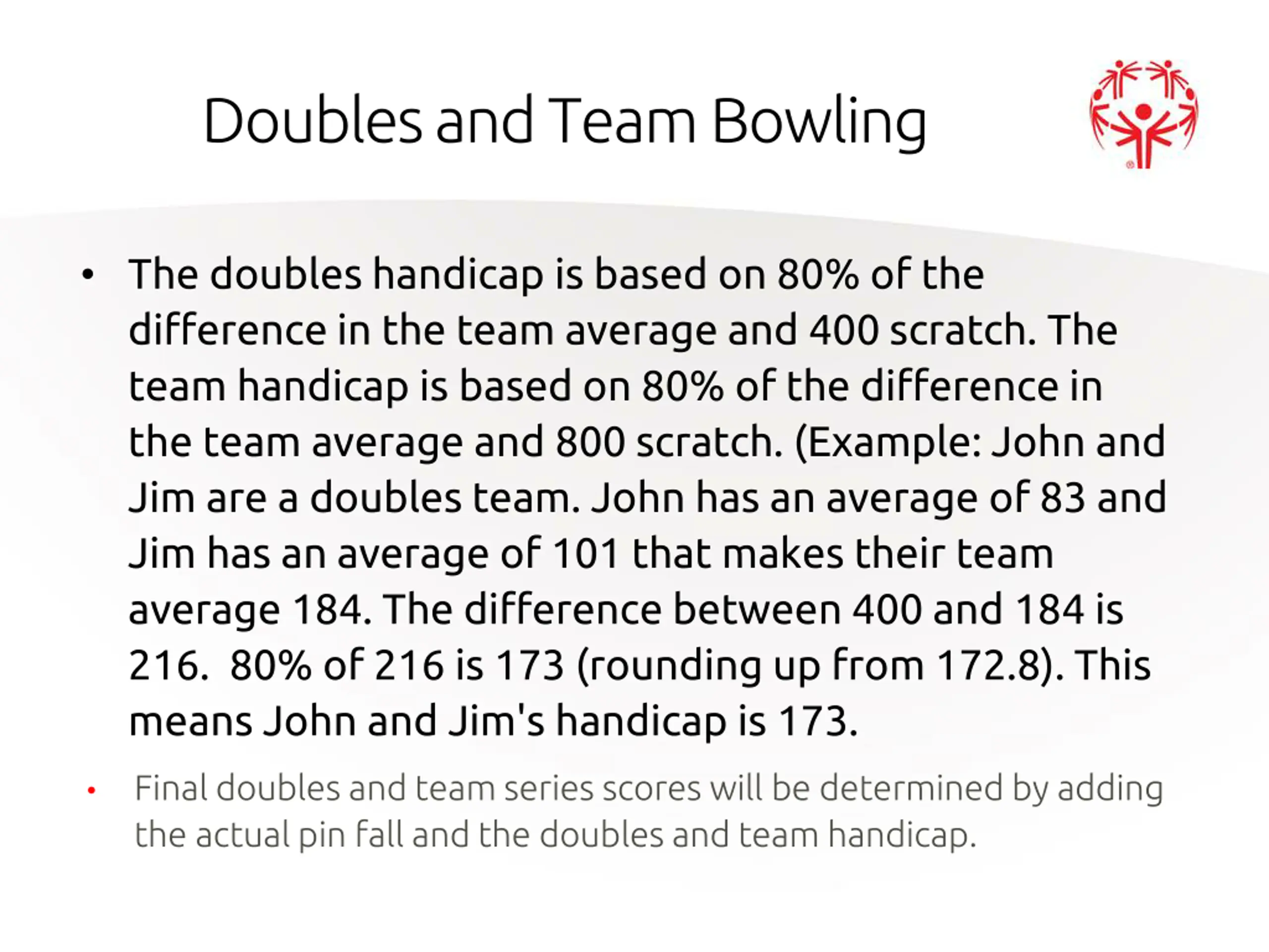Doubles and Team Bowling The doubles handicap is based on 80% of the difference in the team average and 400 scratch. The team handicap is based on 80% of the difference in the team average and 800 scratch. (Example: John and Jim are a doubles team. John has an average of 83 and Jim has an average of 101 that makes their team average 184. The difference between 400 and 184 is 216. 80% of 216 is 173 (rounding up from 172.8). This means John and Jim's handicap is 173. Final doubles and team series scores will be determined by adding the actual pin fall and the doubles and team handicap.