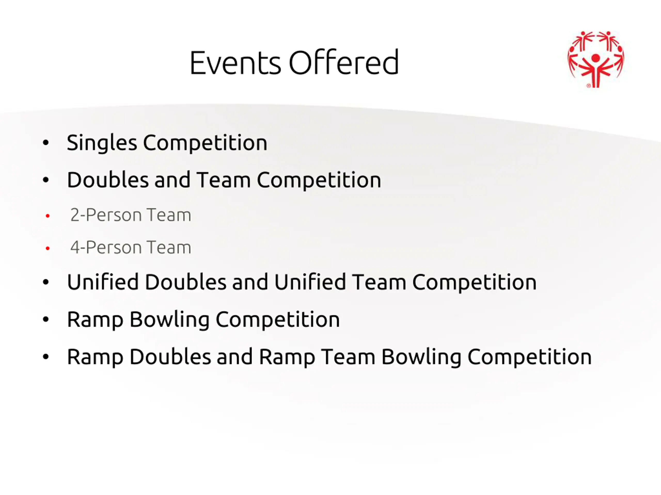 Events Offered Singles Competition Doubles and Team Competition 2-Person Team 4-Person Team Unified Doubles and Unified Team Competition Ramp Bowling Competition Ramp Doubles and Ramp Team Bowling Competition