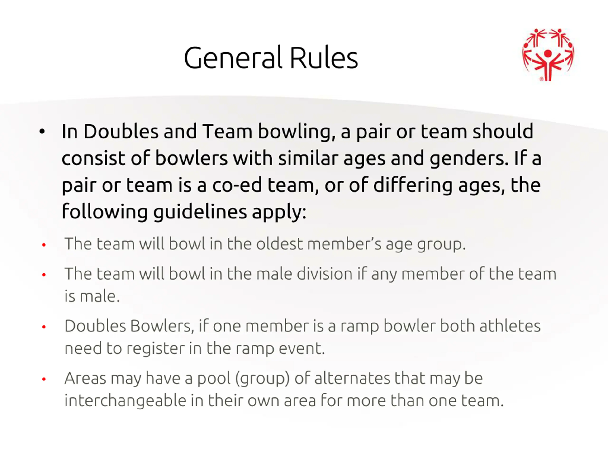 General Rules In Doubles and Team bowling, a pair or team should consist of bowlers with similar ages and genders. If a pair or team is a co-ed team, or of differing ages, the following guidelines apply: The team will bowl in the oldest member s age group. The team will bowl in the male division if any member of the team is male. Doubles Bowlers, if one member is a ramp bowler both athletes need to register in the ramp event. Areas may have a pool (group) of alternates that may be interchangeable in their own area for more than one team.