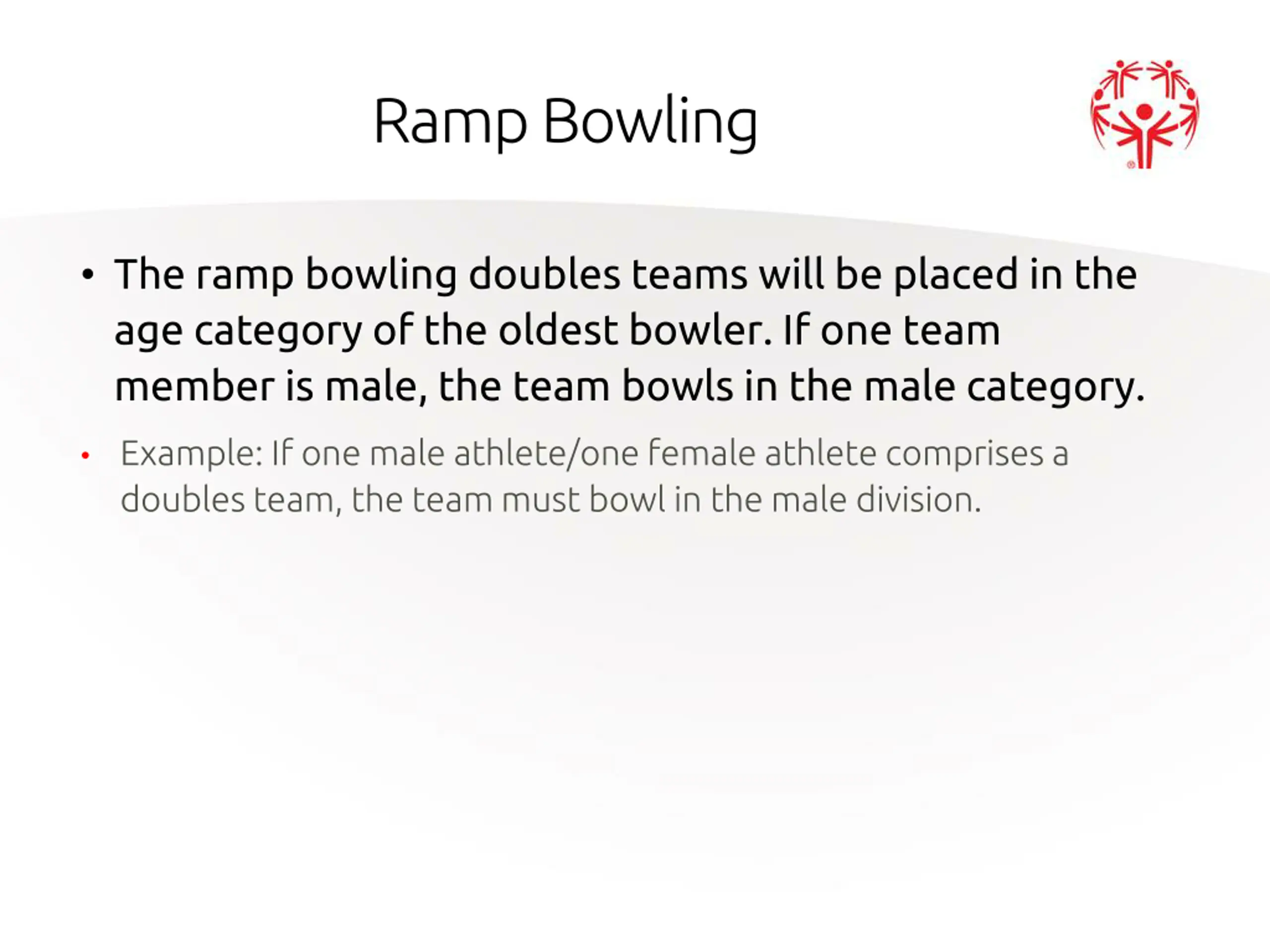 Ramp Bowling The ramp bowling doubles teams will be placed in the age category of the oldest bowler. If one team member is male, the team bowls in the male category. Example: If one male athlete/one female athlete comprises a doubles team, the team must bowl in the male division.