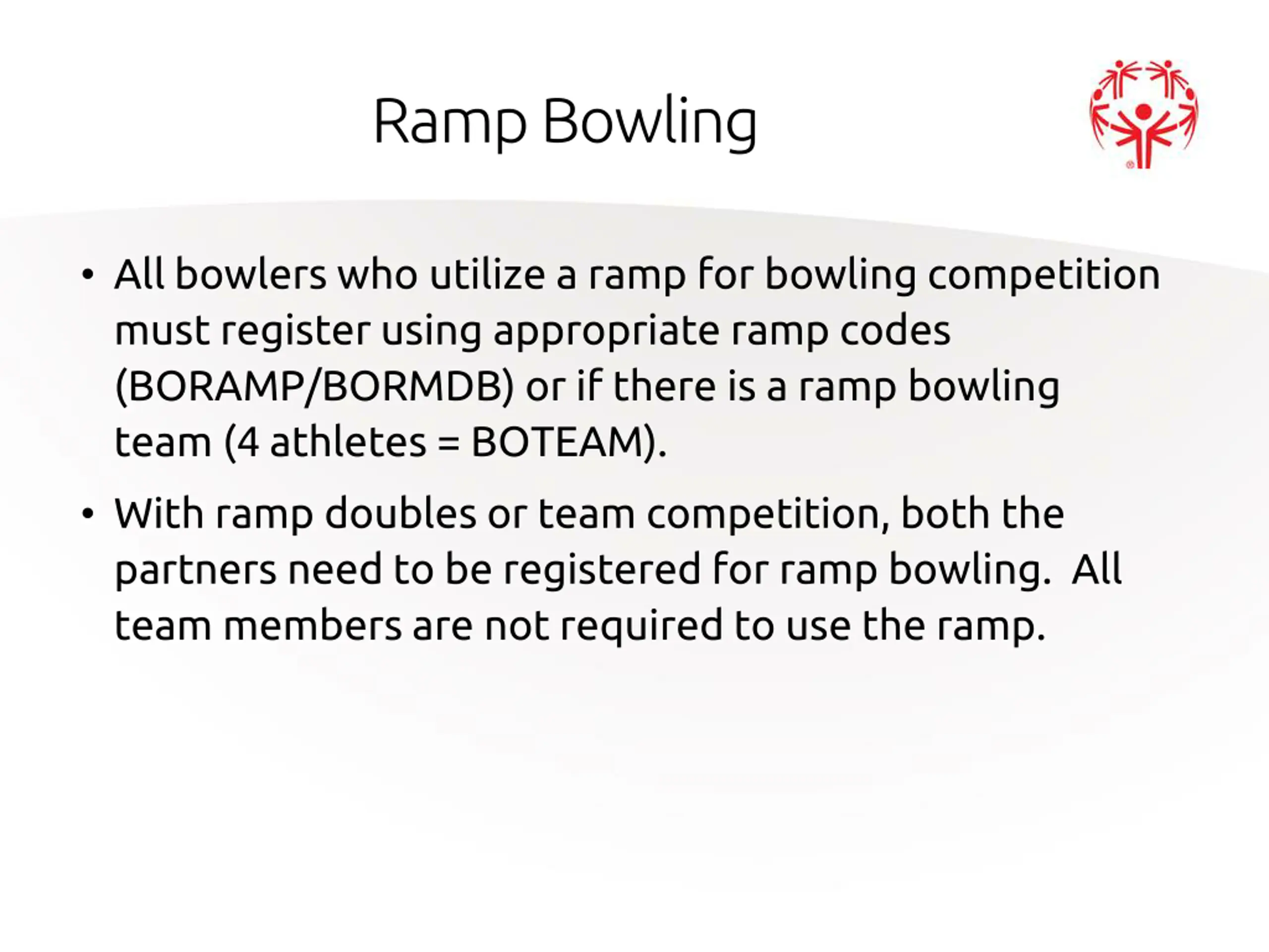 Ramp Bowling All bowlers who utilize a ramp for bowling competition must register using appropriate ramp codes (BORAMP/BORMDB) or if there is a ramp bowling team (4 athletes = BOTEAM). With ramp doubles or team competition, both the partners need to be registered for ramp bowling. All team members are not required to use the ramp.