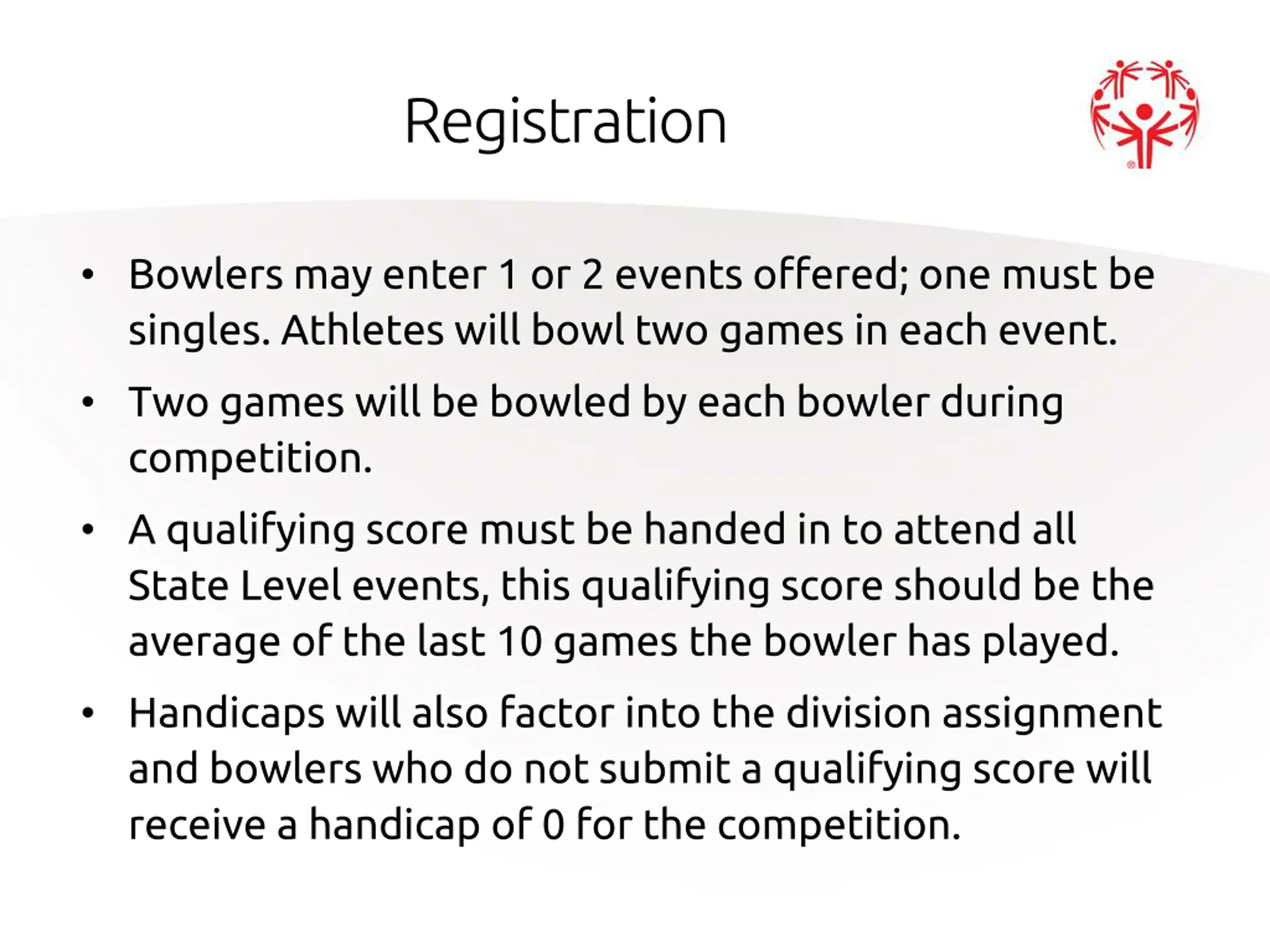 Registration Bowlers may enter 1 or 2 events offered; one must be singles. Athletes will bowl two games in each event. Two games will be bowled by each bowler during competition. A qualifying score must be handed in to attend all State Level events, this qualifying score should be the average of the last 10 games the bowler has played. Handicaps will also factor into the division assignment and bowlers who do not submit a qualifying score will receive a handicap of 0 for the competition.