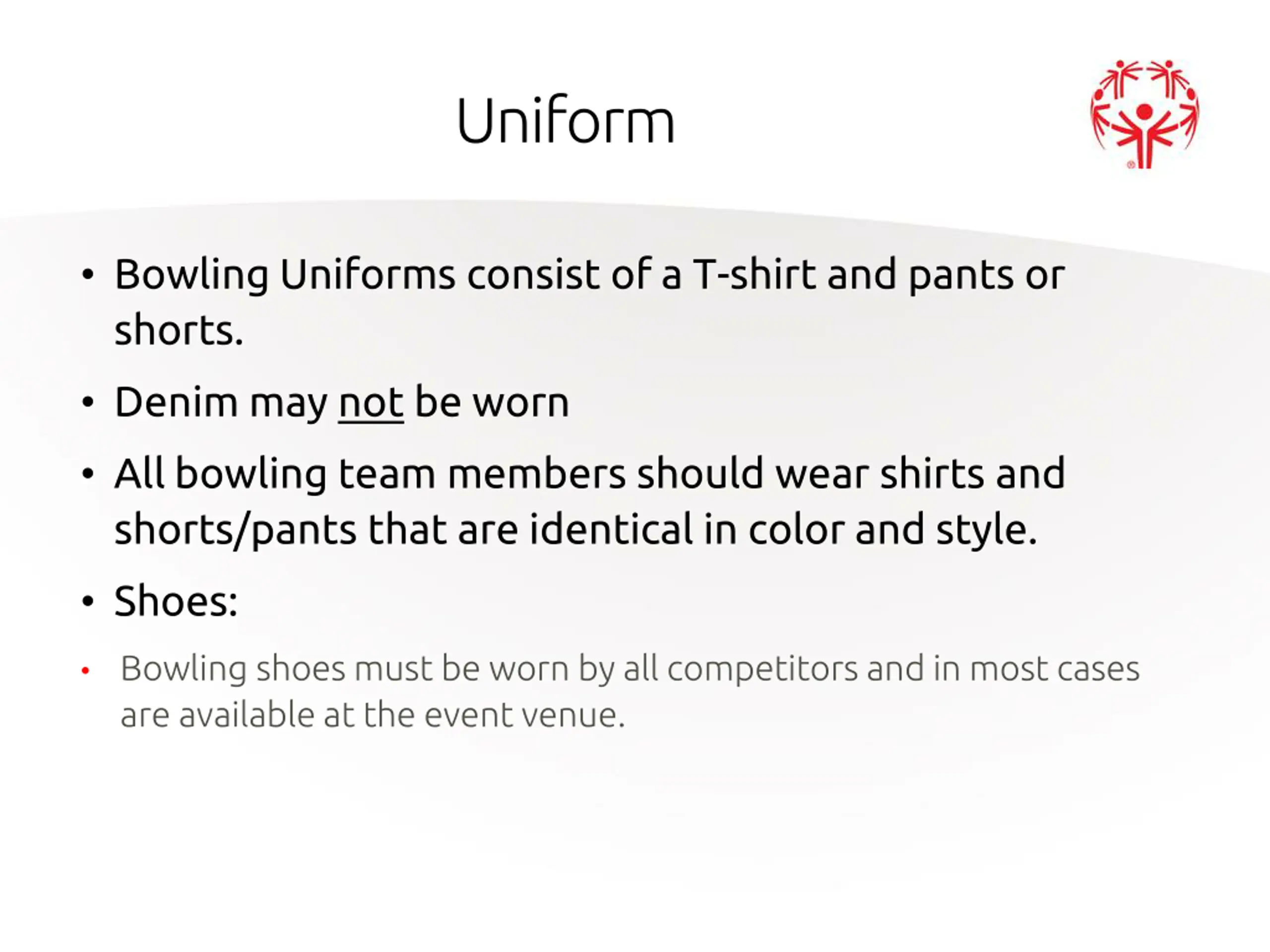 Uniform Bowling Uniforms consist of a T-shirt and pants or shorts. Denim may not be worn All bowling team members should wear shirts and shorts/pants that are identical in color and style. Shoes: Bowling shoes must be worn by all competitors and in most cases are available at the event venue.