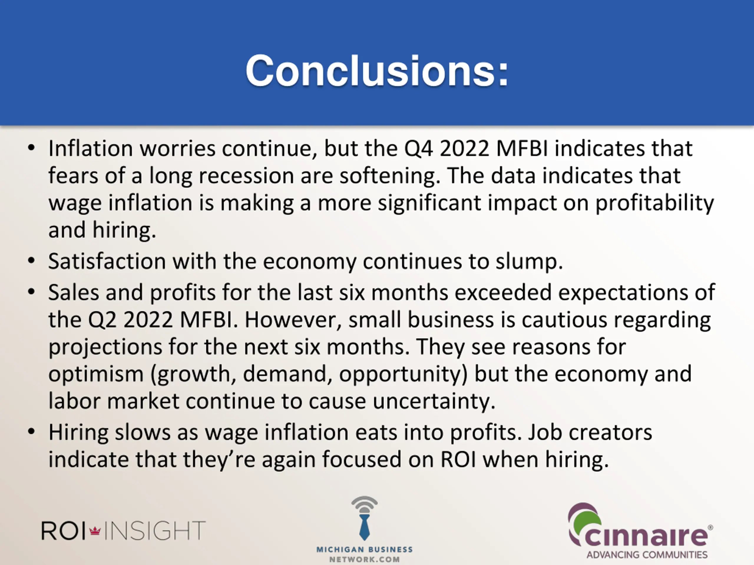 Conclusions: Inflation worries continue, but the Q4 2022 MFBI indicates that fears of a long recession are softening. The data indicates that wage inflation is making a more significant impact on profitability and hiring. Satisfaction with the economy continues to slump. Sales and profits for the last six months exceeded expectations of the Q2 2022 MFBI. However, small business is cautious regarding projections for the next six months. They see reasons for optimism (growth, demand, opportunity) but the economy and labor market continue to cause uncertainty. Hiring slows as wage inflation eats into profits. Job creators indicate that they re again focused on ROI when hiring.