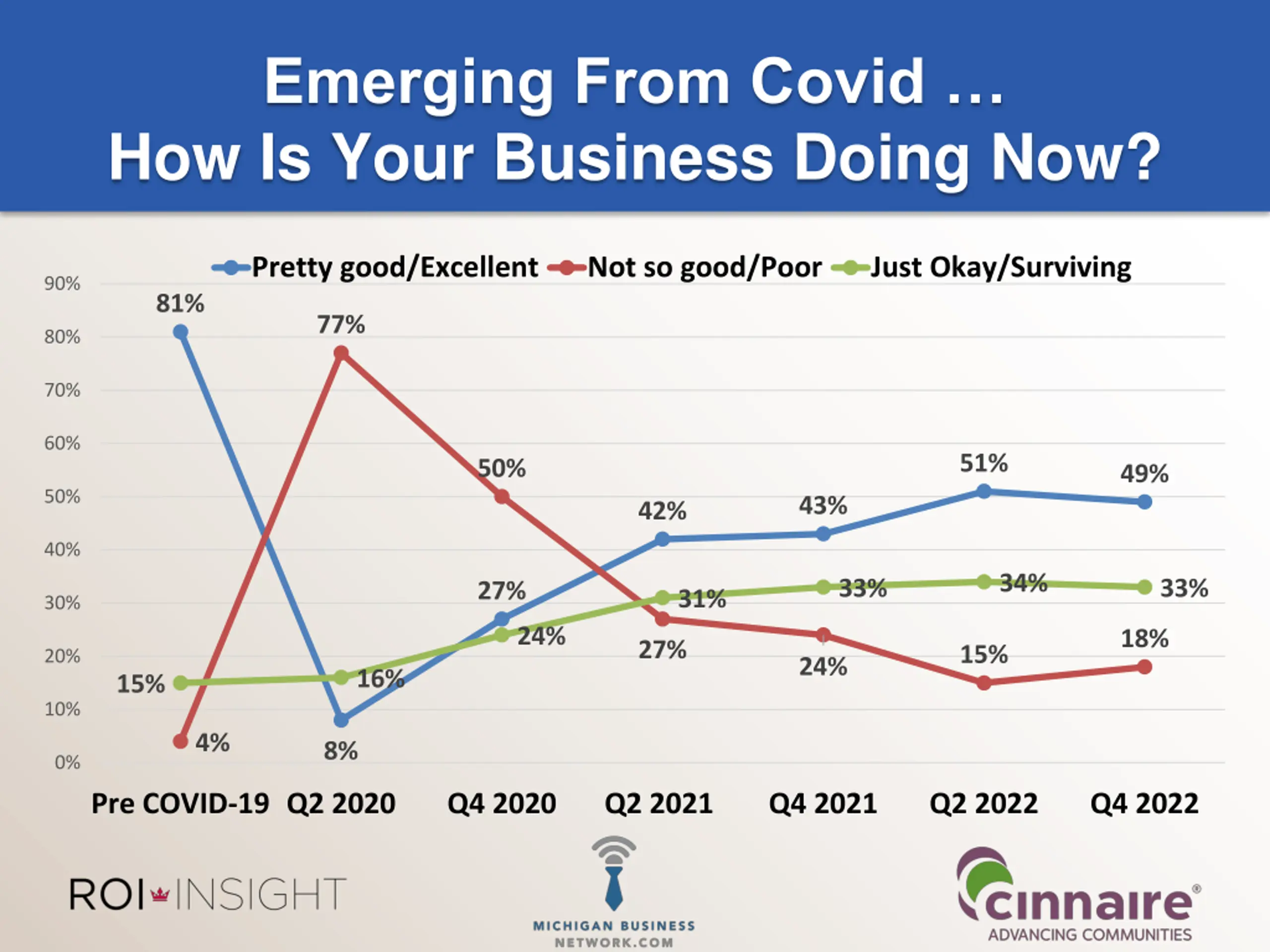 Emerging From Covid How Is Your Business Doing Now? Pretty good/Excellent Not so good/Poor Just Okay/Surviving 90% 81% 77% 80% 70% 60% 51% 50% 49% 50% 43% 42% 40% 34% 33% 33% 27% 31% 30% 24% 18% 27% 15% 20% 24% 16% 15% 10% 4% 8% 0% Pre COVID-19 Q2 2020 Q4 2020 Q2 2021 Q4 2021 Q2 2022 Q4 2022