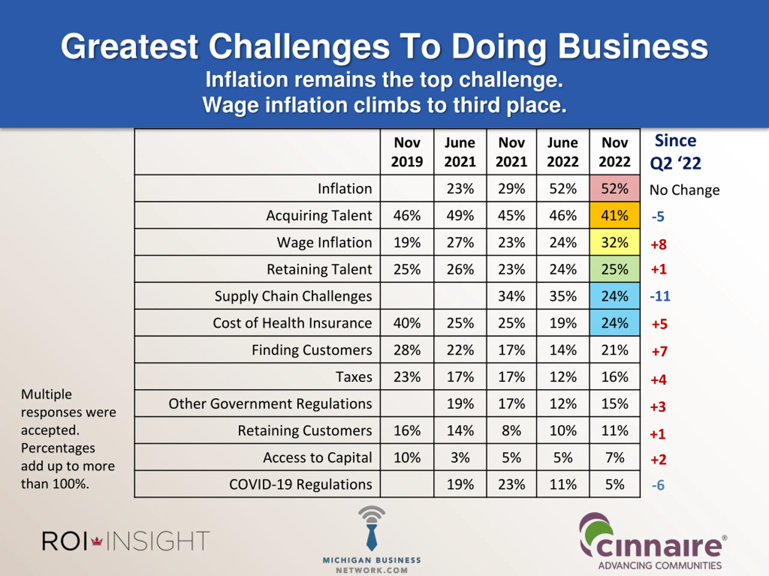 Greatest Challenges To Doing Business Inflation remains the top challenge. Wage inflation climbs to third place. Since Q2 22 Nov 2019 June 2021 Nov 2021 June 2022 Nov 2022 Inflation 23% 29% 52% 52% No Change Acquiring Talent 46% 49% 45% 46% 41% -5 Wage Inflation 19% 27% 23% 24% 32% +8 +1 Retaining Talent 25% 26% 23% 24% 25% -11 Supply Chain Challenges 34% 35% 24% Cost of Health Insurance 40% 25% 25% 19% 24% +5 Finding Customers 28% 22% 17% 14% 21% +7 Taxes 23% 17% 17% 12% 16% +4 Multiple responses were accepted. Percentages add up to more than 100%. Other Government Regulations 19% 17% 12% 15% +3 Retaining Customers 16% 14% 8% 10% 11% +1 Access to Capital 10% 3% 5% 5% 7% +2 COVID-19 Regulations 19% 23% 11% 5% -6