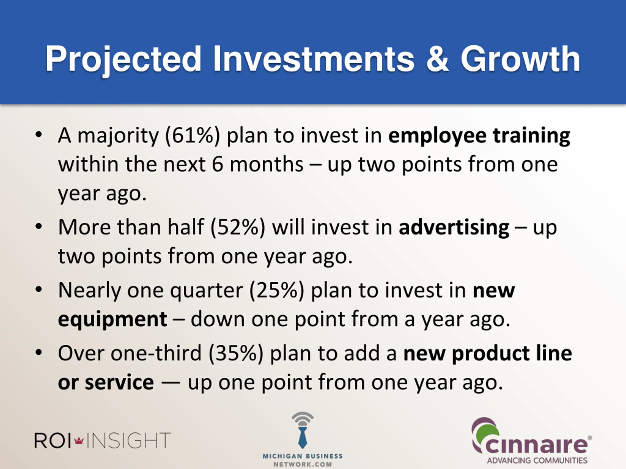 Projected Investments & Growth A majority (61%) plan to invest in employee training within the next 6 months up two points from one year ago. More than half (52%) will invest in advertising up two points from one year ago. Nearly one quarter (25%) plan to invest in new equipment down one point from a year ago. Over one-third (35%) plan to add a new product line or service up one point from one year ago.