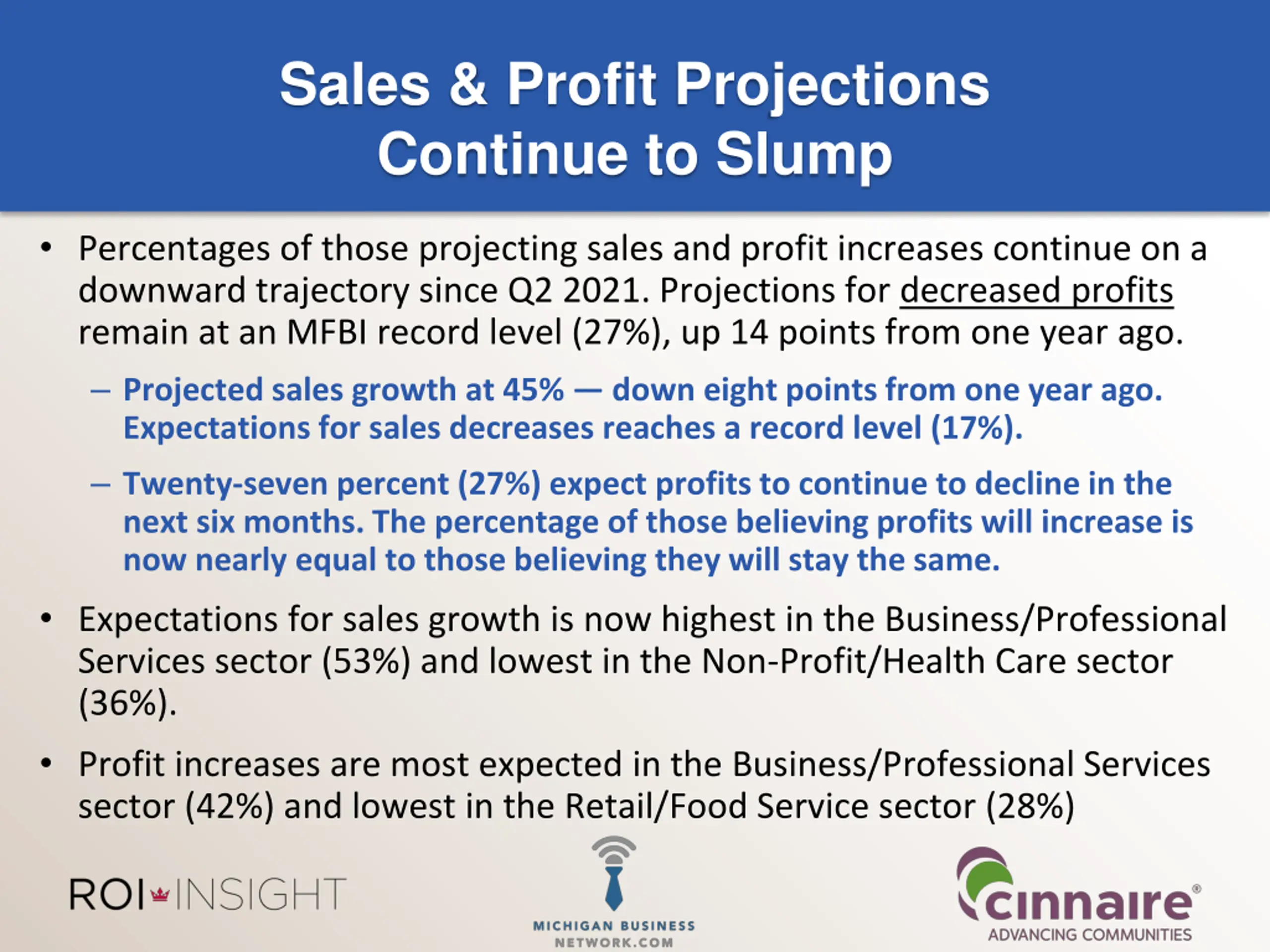 Sales & Profit Projections Continue to Slump Percentages of those projecting sales and profit increases continue on a downward trajectory since Q2 2021. Projections for decreased profits remain at an MFBI record level (27%), up 14 points from one year ago. Projected sales growth at 45% down eight points from one year ago. Expectations for sales decreases reaches a record level (17%). Twenty-seven percent (27%) expect profits to continue to decline in the next six months. The percentage of those believing profits will increase is now nearly equal to those believing they will stay the same. Expectations for sales growth is now highest in the Business/Professional Services sector (53%) and lowest in the Non-Profit/Health Care sector (36%). Profit increases are most expected in the Business/Professional Services sector (42%) and lowest in the Retail/Food Service sector (28%)
