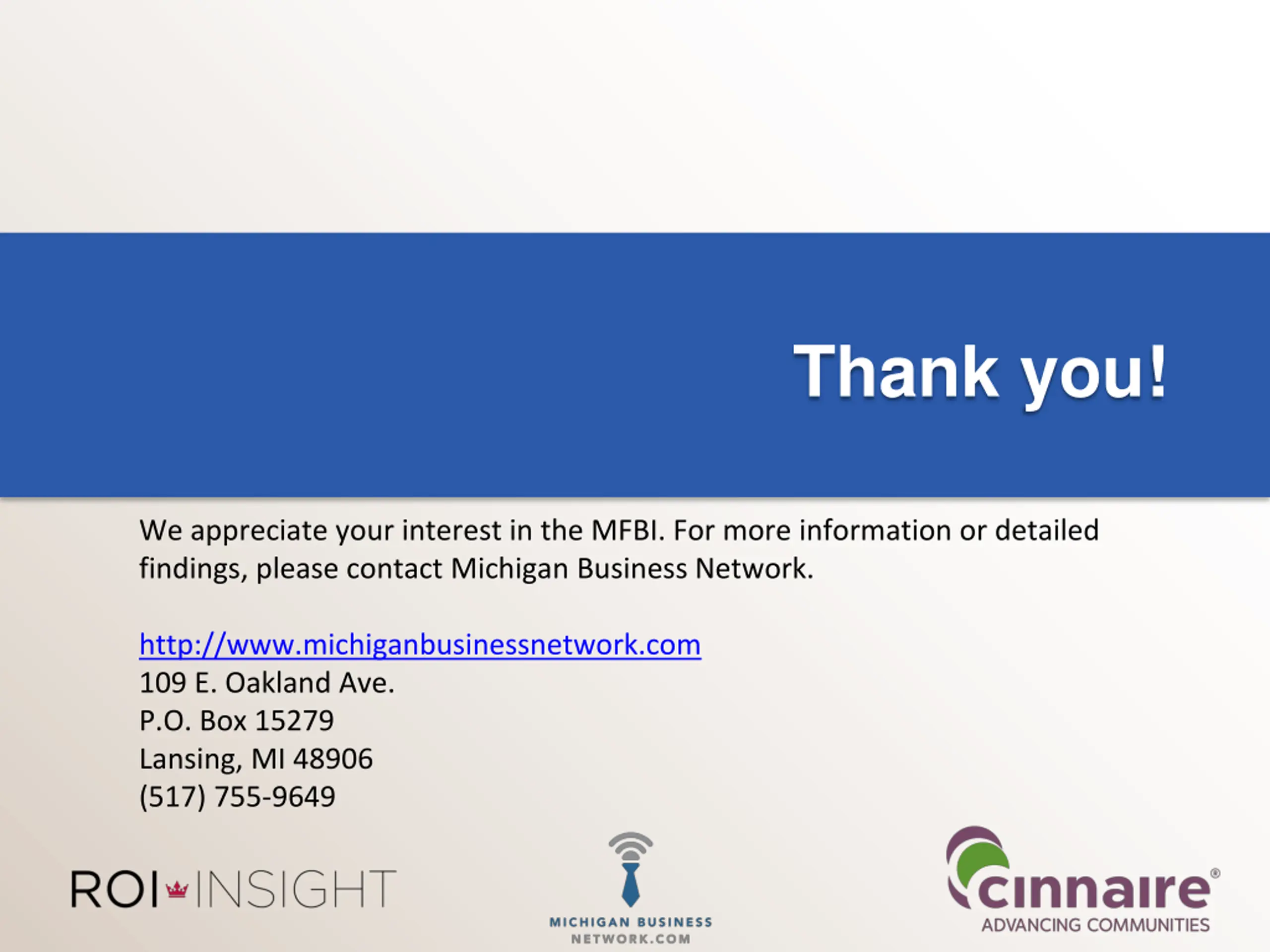 Thank you! We appreciate your interest in the MFBI. For more information or detailed findings, please contact Michigan Business Network. http://www.michiganbusinessnetwork.com 109 E. Oakland Ave. P.O. Box 15279 Lansing, MI 48906 (517) 755-9649
