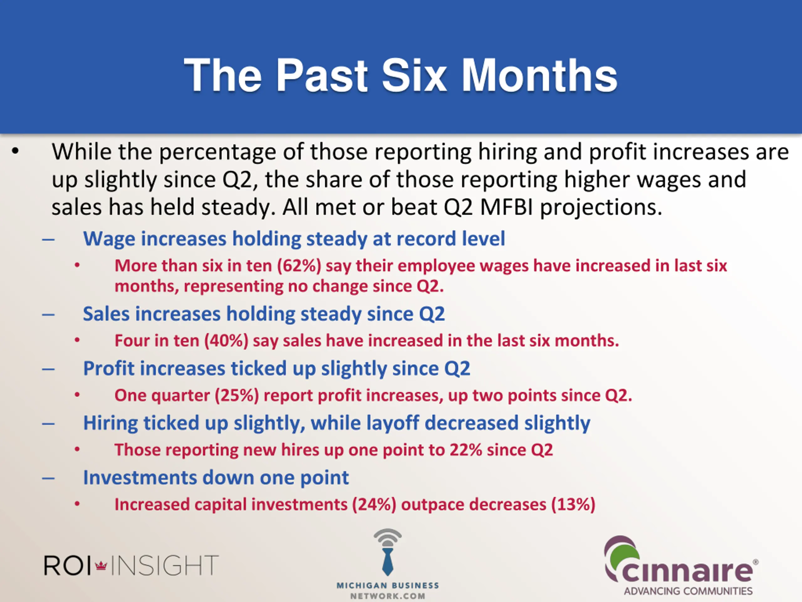 The Past Six Months While the percentage of those reporting hiring and profit increases are up slightly since Q2, the share of those reporting higher wages and sales has held steady. All met or beat Q2 MFBI projections. Wage increases holding steady at record level More than six in ten (62%) say their employee wages have increased in last six months, representing no change since Q2. Sales increases holding steady since Q2 Four in ten (40%) say sales have increased in the last six months. Profit increases ticked up slightly since Q2 One quarter (25%) report profit increases, up two points since Q2. Hiring ticked up slightly, while layoff decreased slightly Those reporting new hires up one point to 22% since Q2 Investments down one point Increased capital investments (24%) outpace decreases (13%)