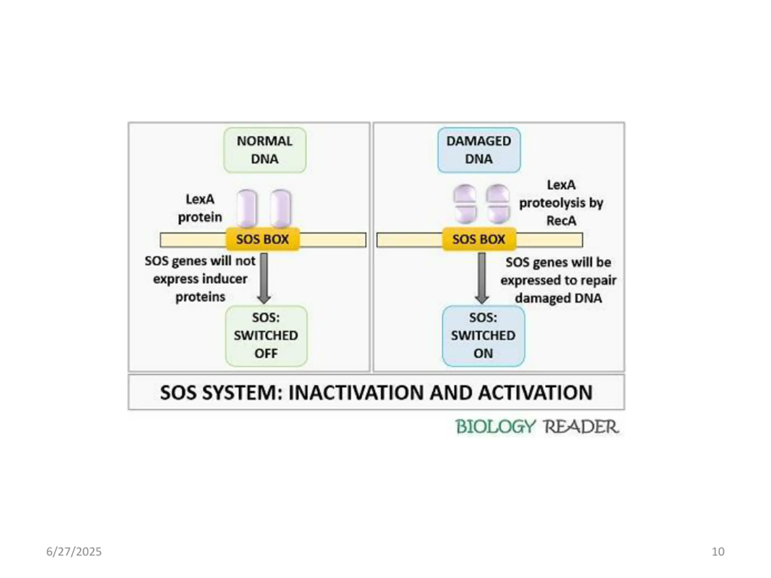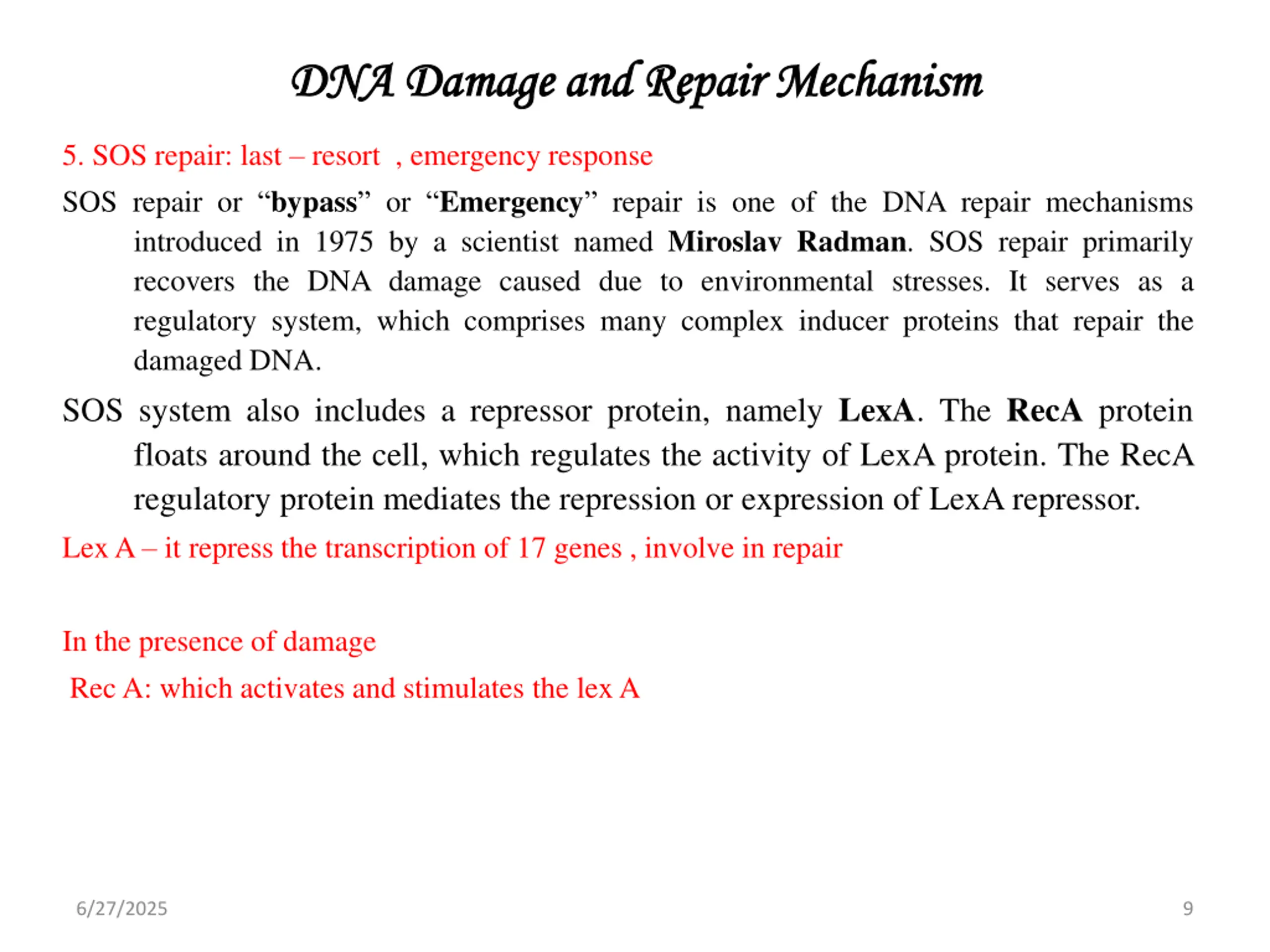 DNA Damage and Repair Mechanism 5. SOS repair: last resort , emergency response SOS repair or bypass or Emergency repair is one of the DNA repair mechanisms introduced in 1975 by a scientist named Miroslav Radman. SOS repair primarily recovers the DNA damage caused due to environmental stresses. It serves as a regulatory system, which comprises many complex inducer proteins that repair the damaged DNA. SOS system also includes a repressor protein, namely LexA. The RecA protein floats around the cell, which regulates the activity of LexA protein. The RecA regulatory protein mediates the repression or expression of LexA repressor. Lex A it repress the transcription of 17 genes , involve in repair DNA Damage and Repair Mechanism In the presence of damage Rec A: which activates and stimulates the lex A 6/27/2025 9