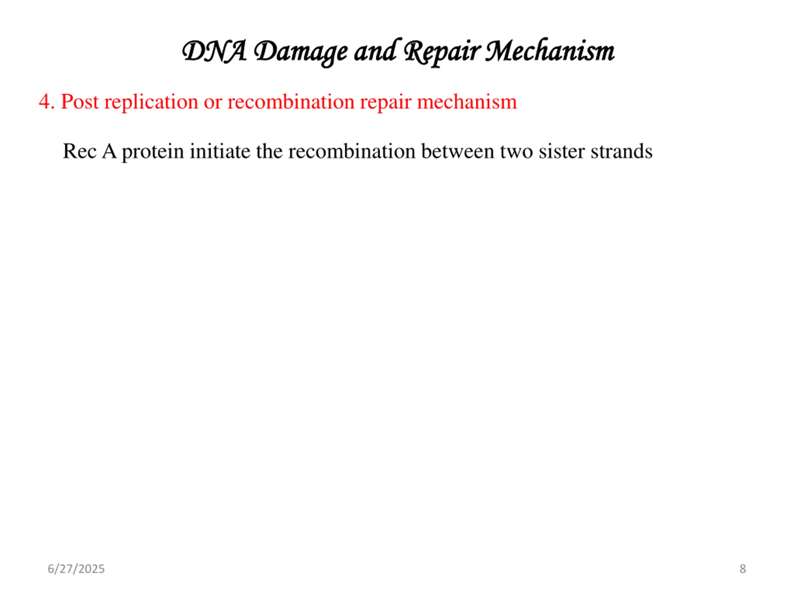 DNA Damage and Repair Mechanism 4. Post replication or recombination repair mechanism DNA Damage and Repair Mechanism Rec A protein initiate the recombination between two sister strands 6/27/2025 8