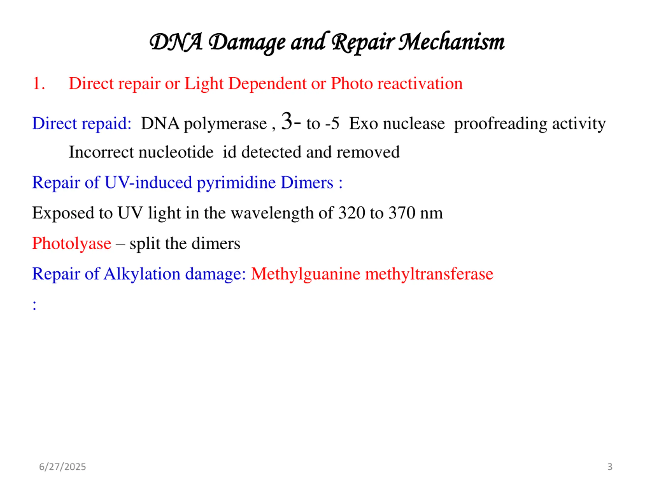DNA Damage and Repair Mechanism Direct repair or Light Dependent or Photo reactivation DNA Damage and Repair Mechanism 1. Direct repaid: DNA polymerase , 3- to -5 Exo nuclease proofreading activity Incorrect nucleotide id detected and removed Repair of UV-induced pyrimidine Dimers : Exposed to UV light in the wavelength of 320 to 370 nm Photolyase split the dimers Repair of Alkylation damage: Methylguanine methyltransferase : 6/27/2025 3
