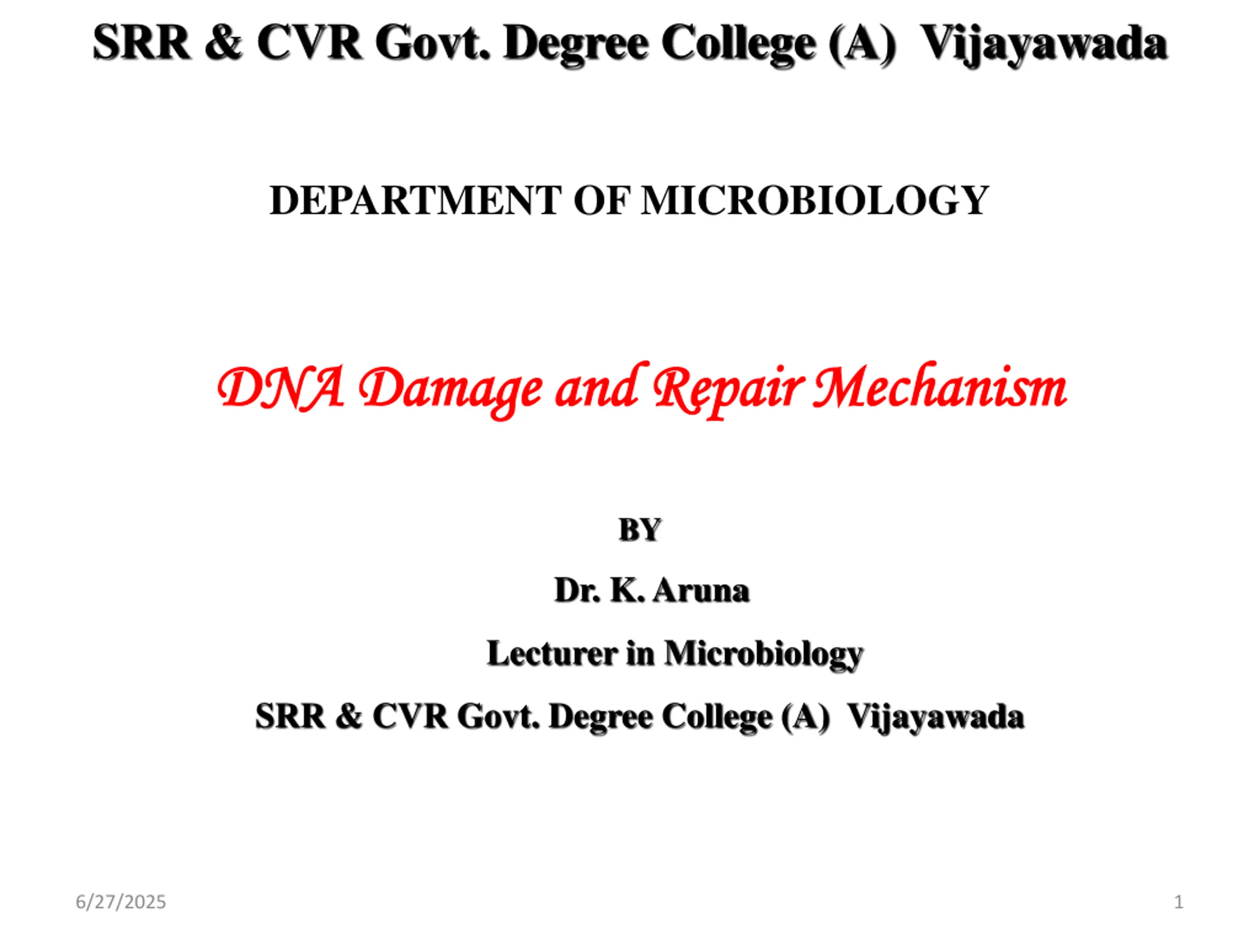 SRR & CVR Govt. Degree College (A) Vijayawada DEPARTMENT OF MICROBIOLOGY DNA Damage and Repair Mechanism DNA Damage and Repair Mechanism BY Dr. K. Aruna Lecturer in Microbiology SRR & CVR Govt. Degree College (A) Vijayawada 6/27/2025 1