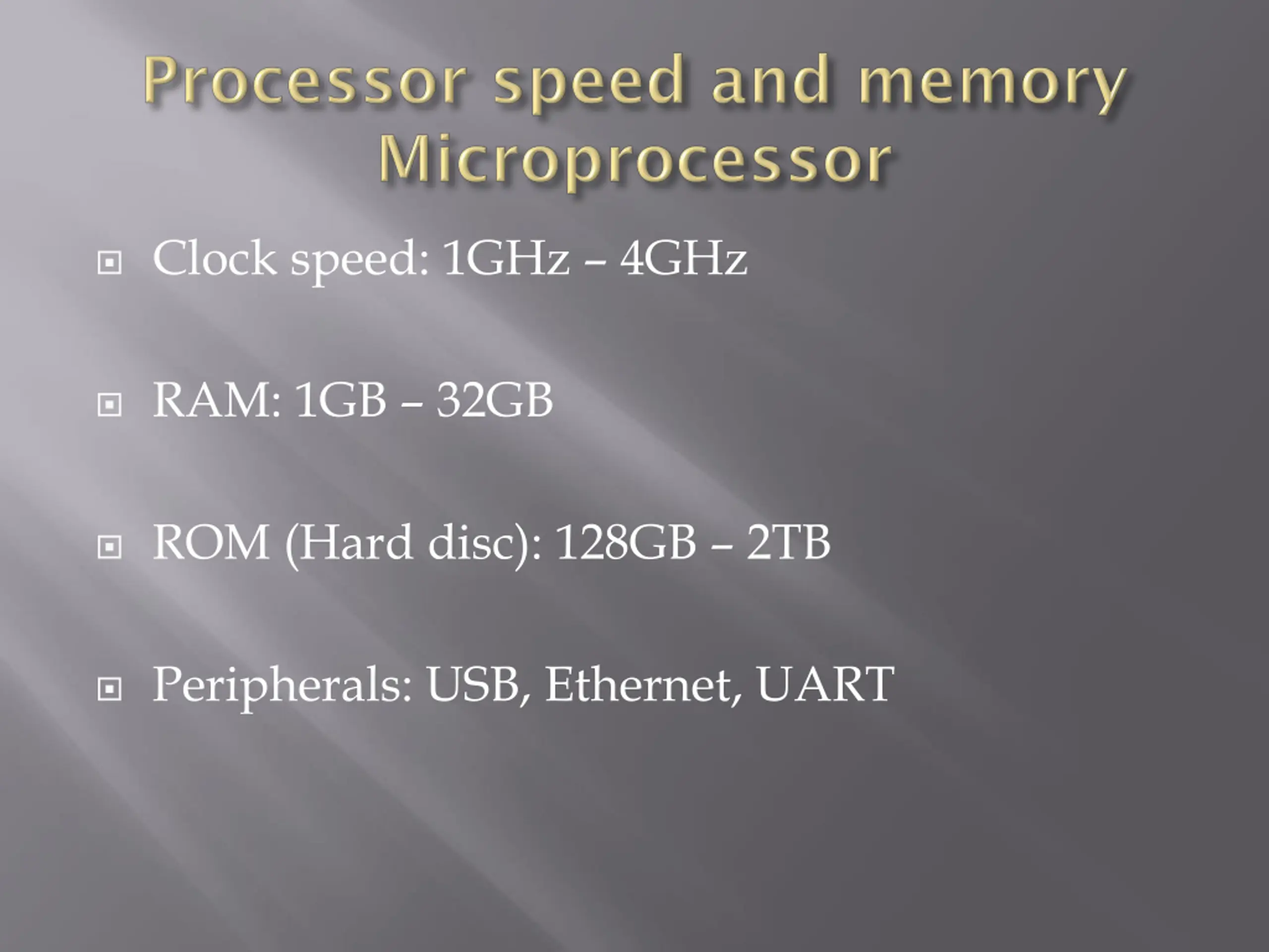 Clock speed: 1GHz 4GHz RAM: 1GB 32GB ROM (Hard disc): 128GB 2TB Peripherals: USB, Ethernet, UART