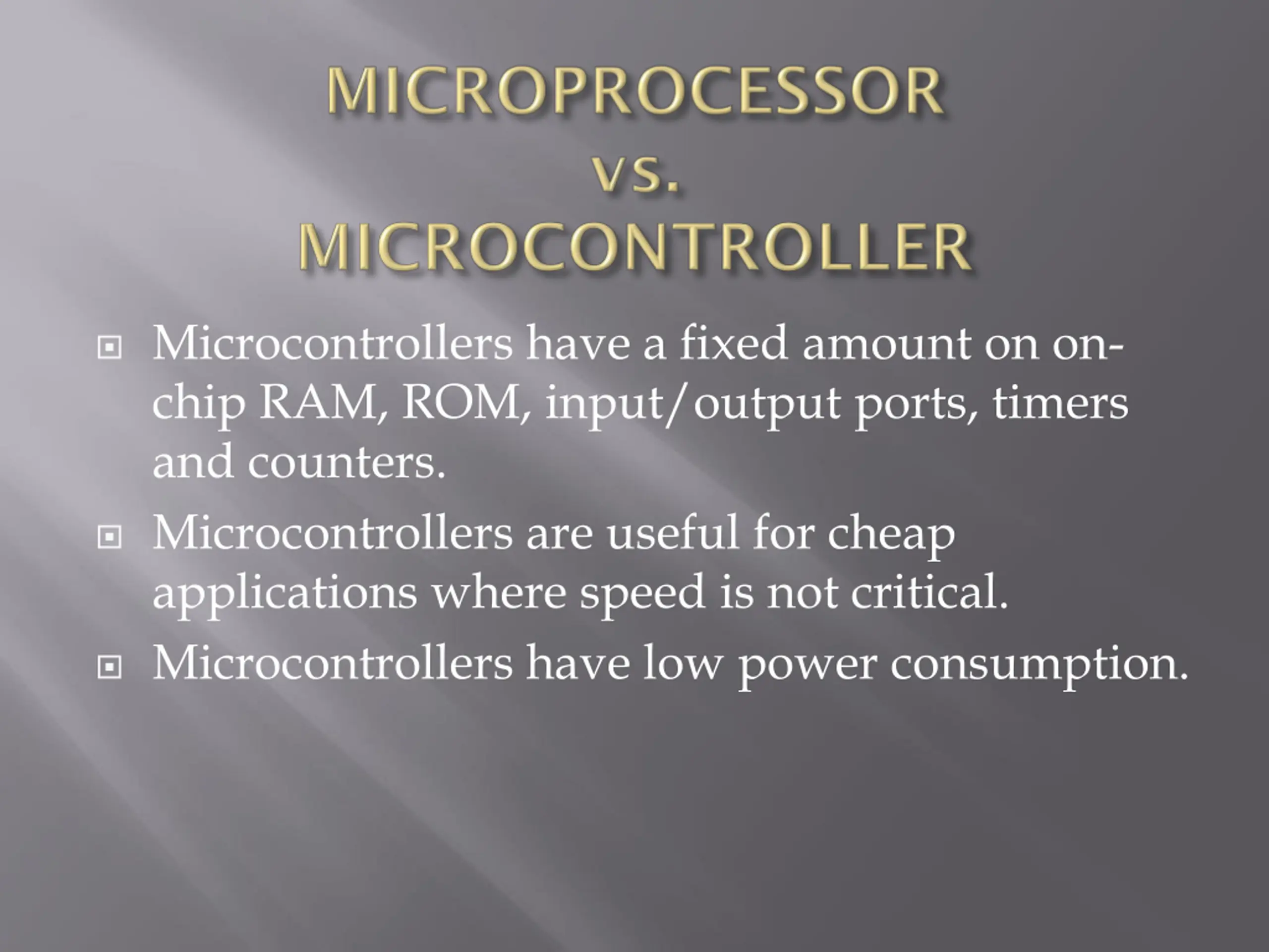 Microcontrollers have a fixed amount on on- chip RAM, ROM, input/output ports, timers and counters. Microcontrollers are useful for cheap applications where speed is not critical. Microcontrollers have low power consumption.