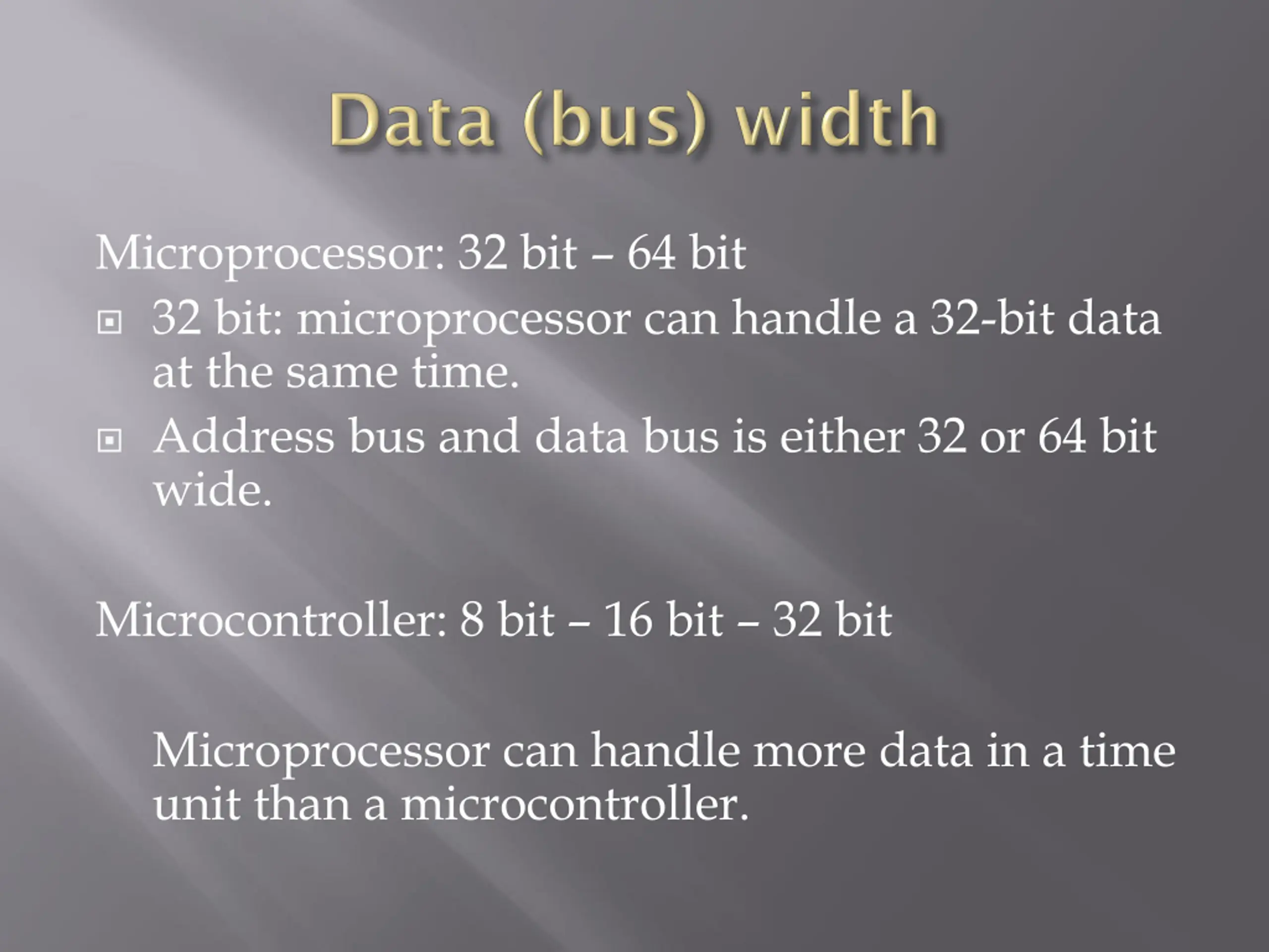 Microprocessor: 32 bit 64 bit 32 bit: microprocessor can handle a 32-bit data at the same time. Address bus and data bus is either 32 or 64 bit wide. Microcontroller: 8 bit 16 bit 32 bit Microprocessor can handle more data in a time unit than a microcontroller.