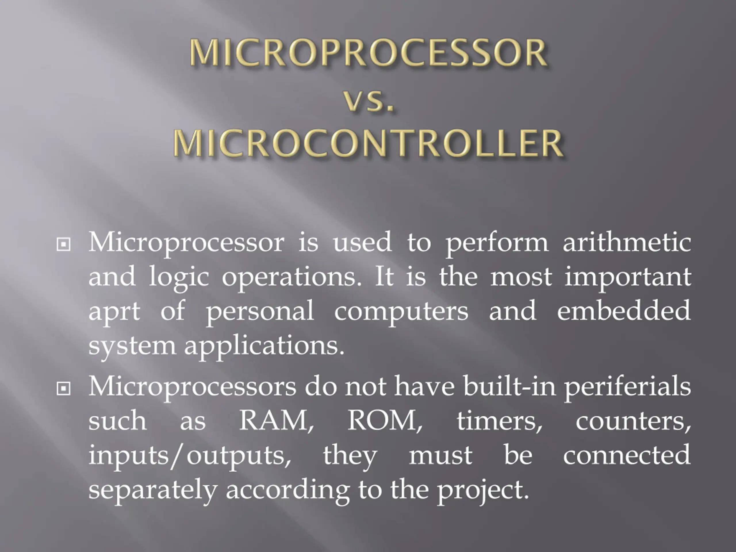 Microprocessor is used to perform arithmetic and logic operations. It is the most important aprt of personal computers and embedded system applications. Microprocessors do not have built-in periferials such as RAM, ROM, inputs/outputs, they separately according to the project. timers, counters, connected must be