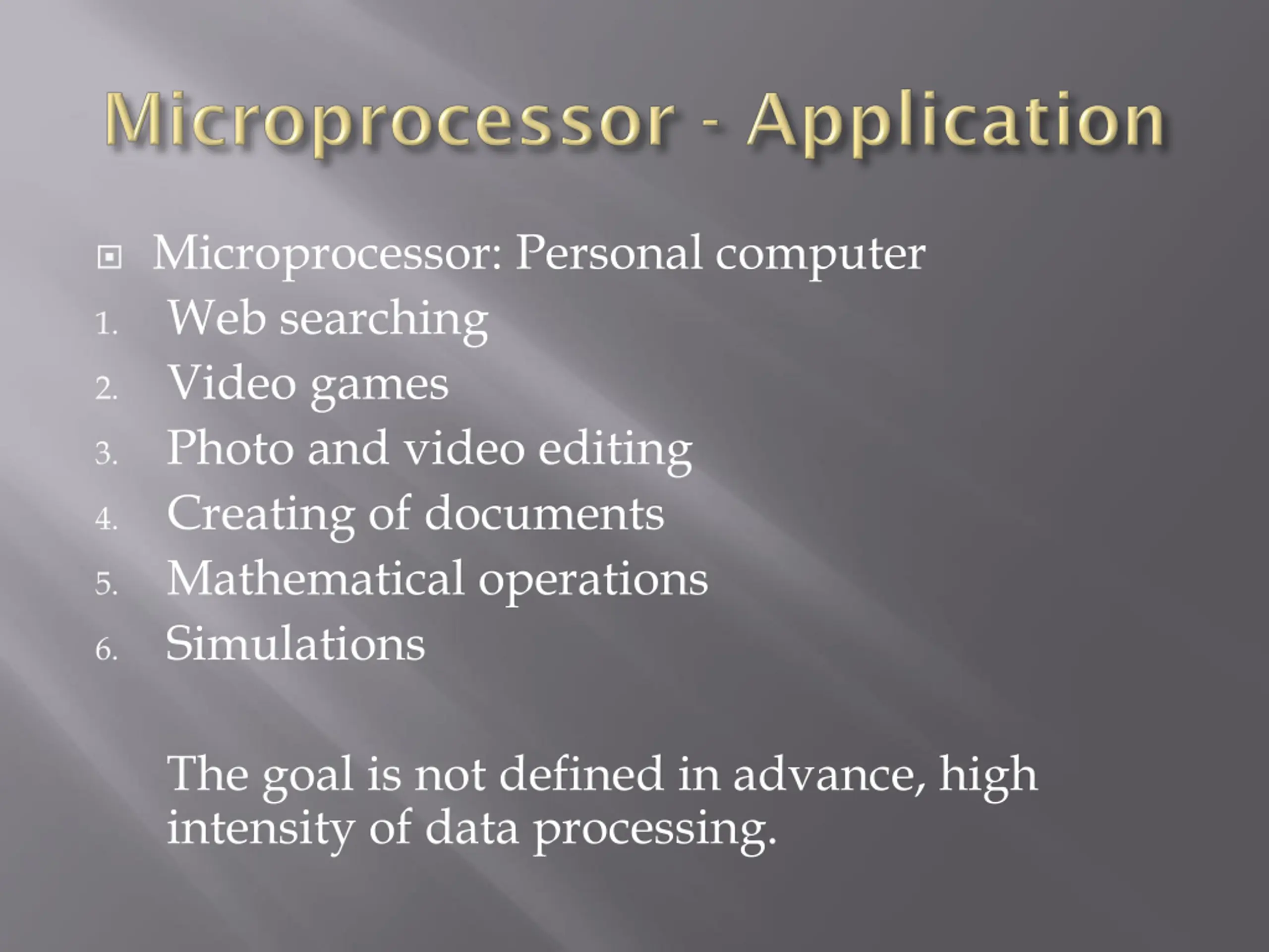 Microprocessor: Personal computer Web searching Video games Photo and video editing Creating of documents Mathematical operations Simulations 1. 2. 3. 4. 5. 6. The goal is not defined in advance, high intensity of data processing.