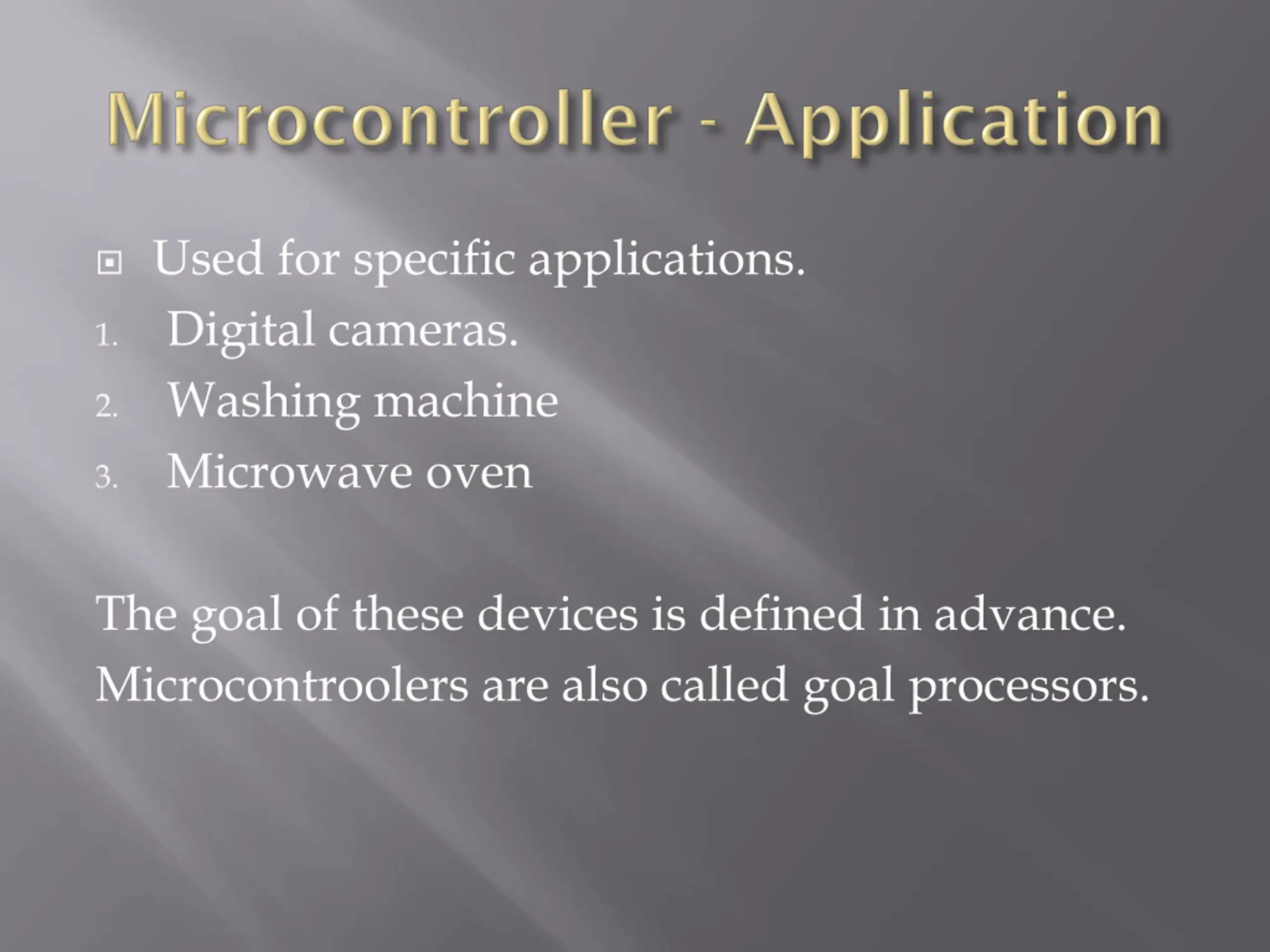 Used for specific applications. Digital cameras. Washing machine Microwave oven 1. 2. 3. The goal of these devices is defined in advance. Microcontroolers are also called goal processors.