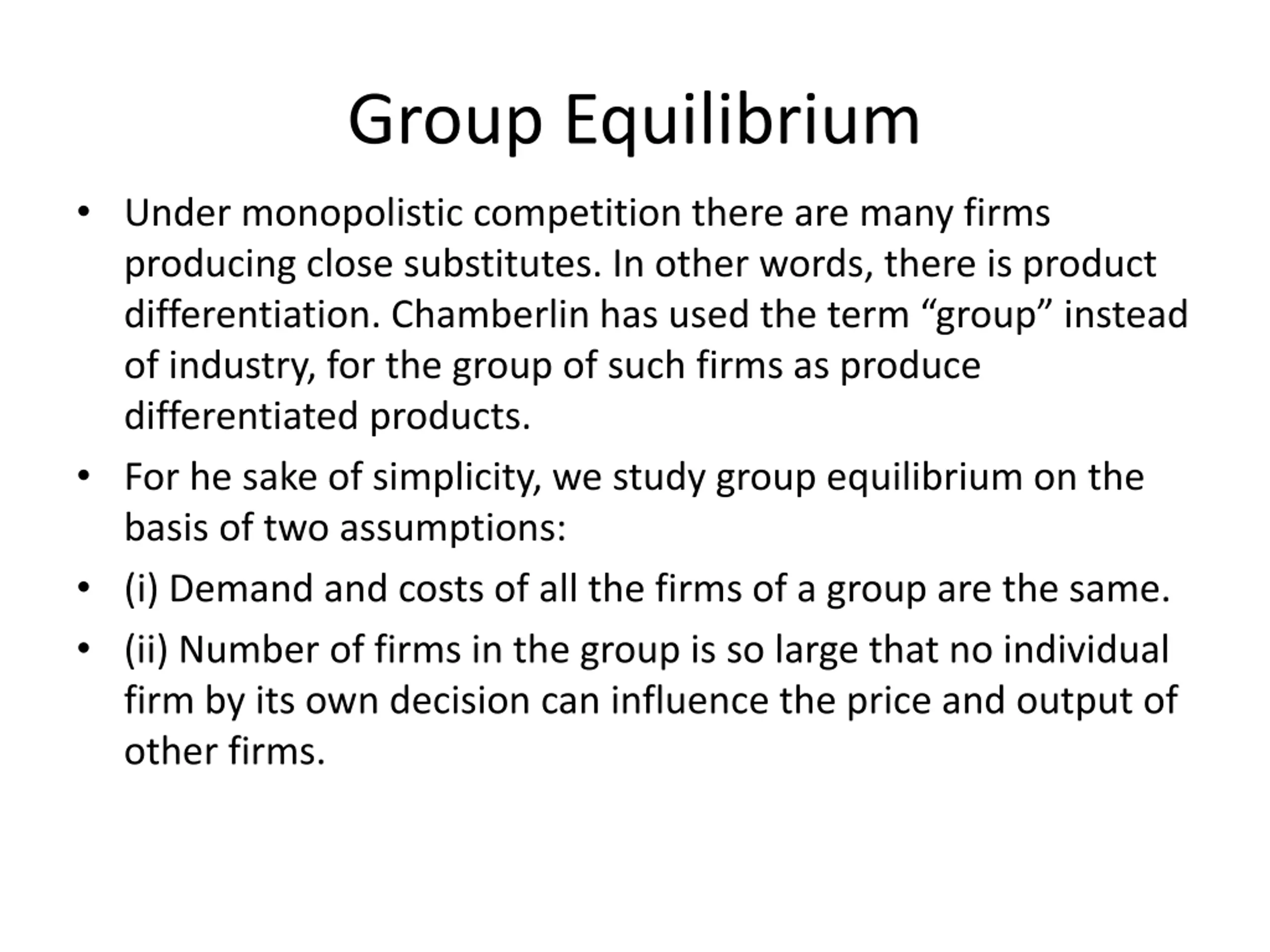 Group Equilibrium Under monopolistic competition there are many firms producing close substitutes. In other words, there is product differentiation. Chamberlin has used the term group instead of industry, for the group of such firms as produce differentiated products. For he sake of simplicity, we study group equilibrium on the basis of two assumptions: (i) Demand and costs of all the firms of a group are the same. (ii) Number of firms in the group is so large that no individual firm by its own decision can influence the price and output of other firms.