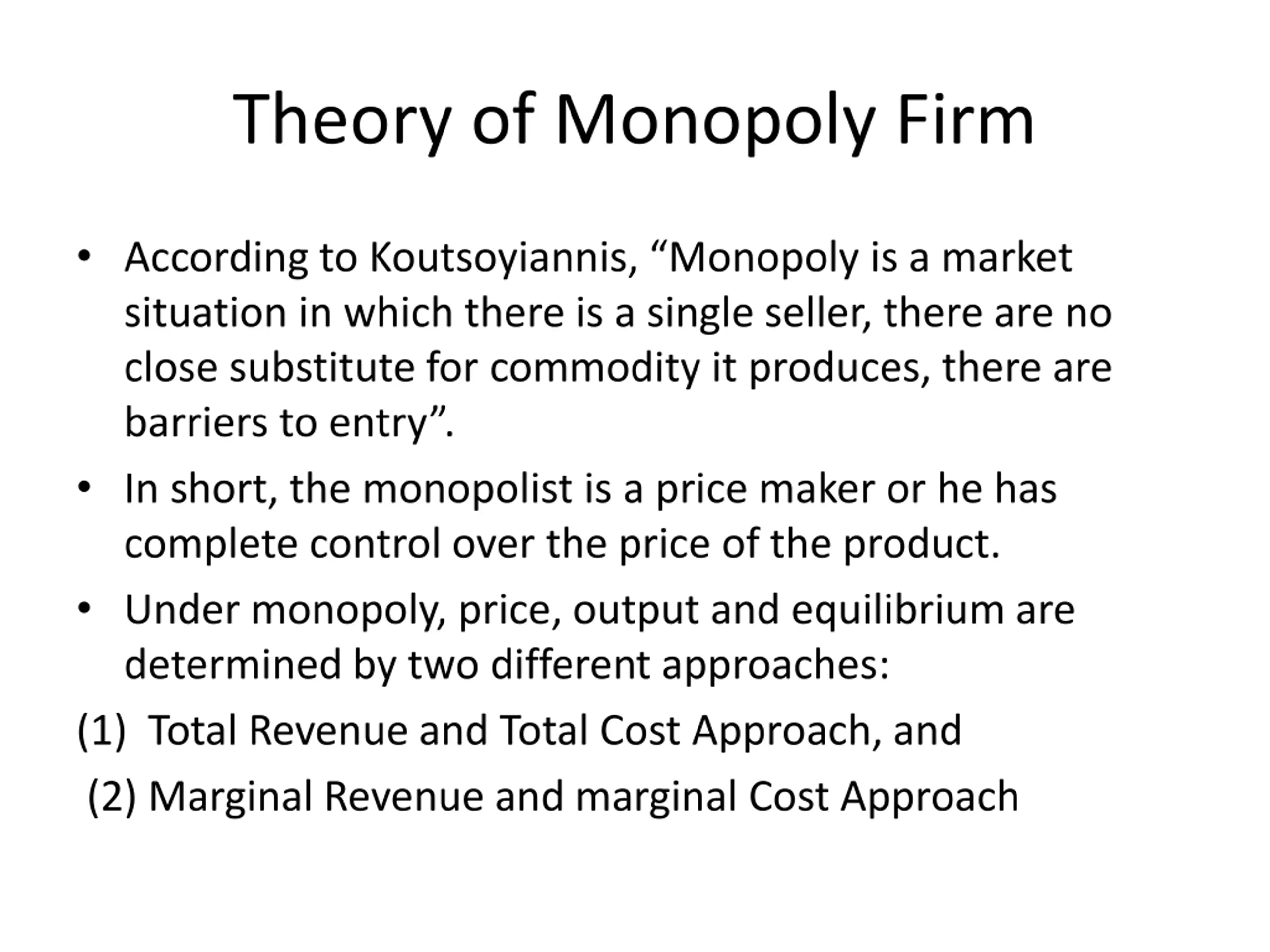 Theory of Monopoly Firm According to Koutsoyiannis, Monopoly is a market situation in which there is a single seller, there are no close substitute for commodity it produces, there are barriers to entry . In short, the monopolist is a price maker or he has complete control over the price of the product. Under monopoly, price, output and equilibrium are determined by two different approaches: (1) Total Revenue and Total Cost Approach, and (2) Marginal Revenue and marginal Cost Approach