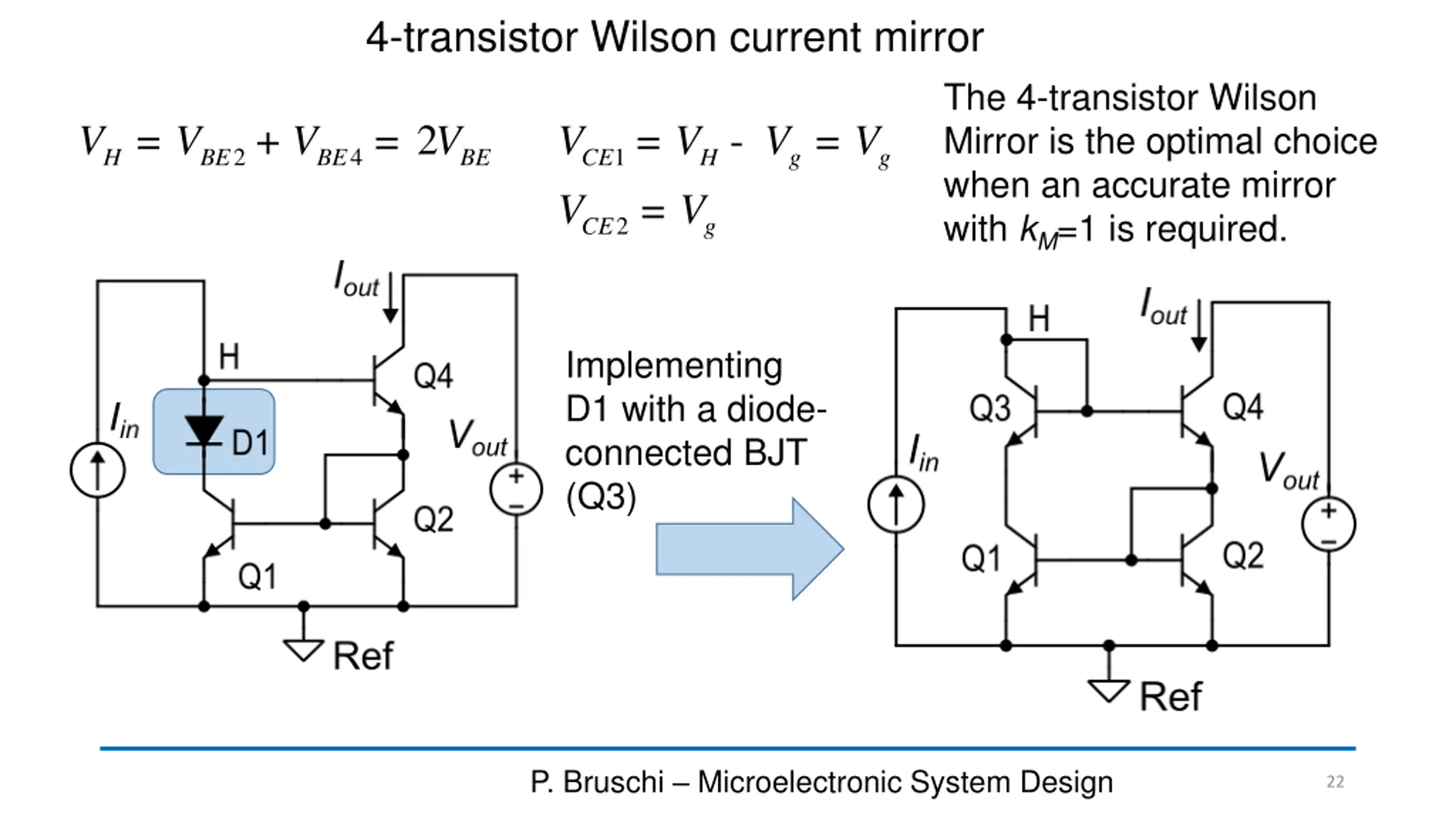 4-transistor Wilson current mirror The 4-transistor Wilson Mirror is the optimal choice when an accurate mirror with kM=1 is required. = + = 2 = = - = V V V V V V V Vg V V 2 4 1 H BE BE BE CE H g g 2 CE Implementing D1 with a diode- connected BJT (Q3) P. Bruschi Microelectronic System Design 22