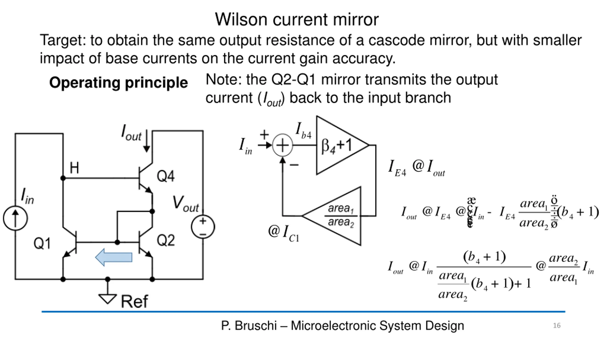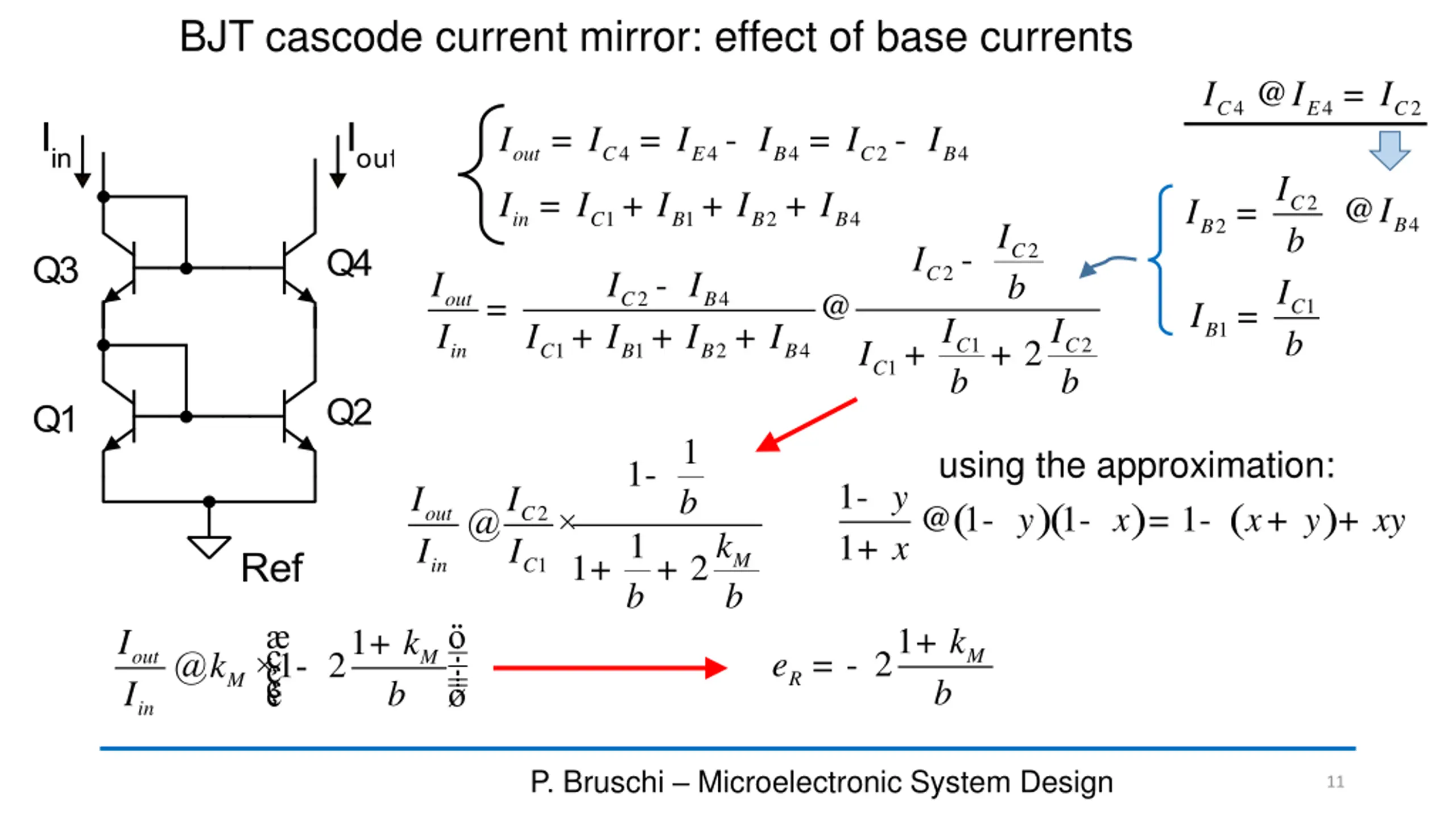 BJT cascode current mirror: Rout BI 4 ( ) @ 1 + r r h 4 4 v o fe ? be r 4 It can be shown that: There is interaction of the output branch (Q2,Q4) with the input one (Q3,Q4) caused by the base currents. This interaction is not present in the cascode MOSFET h 4 f e @ 41 + R r out o 2 P. Bruschi Microelectronic System Design 10