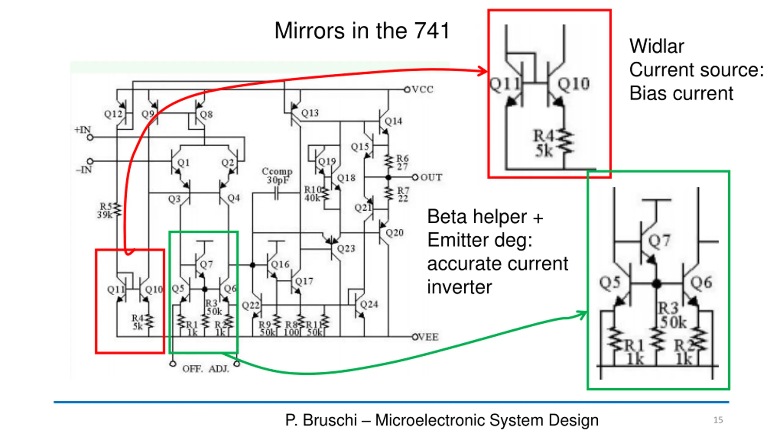 Mirrors in the 741 Widlar Current source: Bias current Beta helper + Emitter deg: accurate current inverter P. Bruschi Microelectronic System Design 15