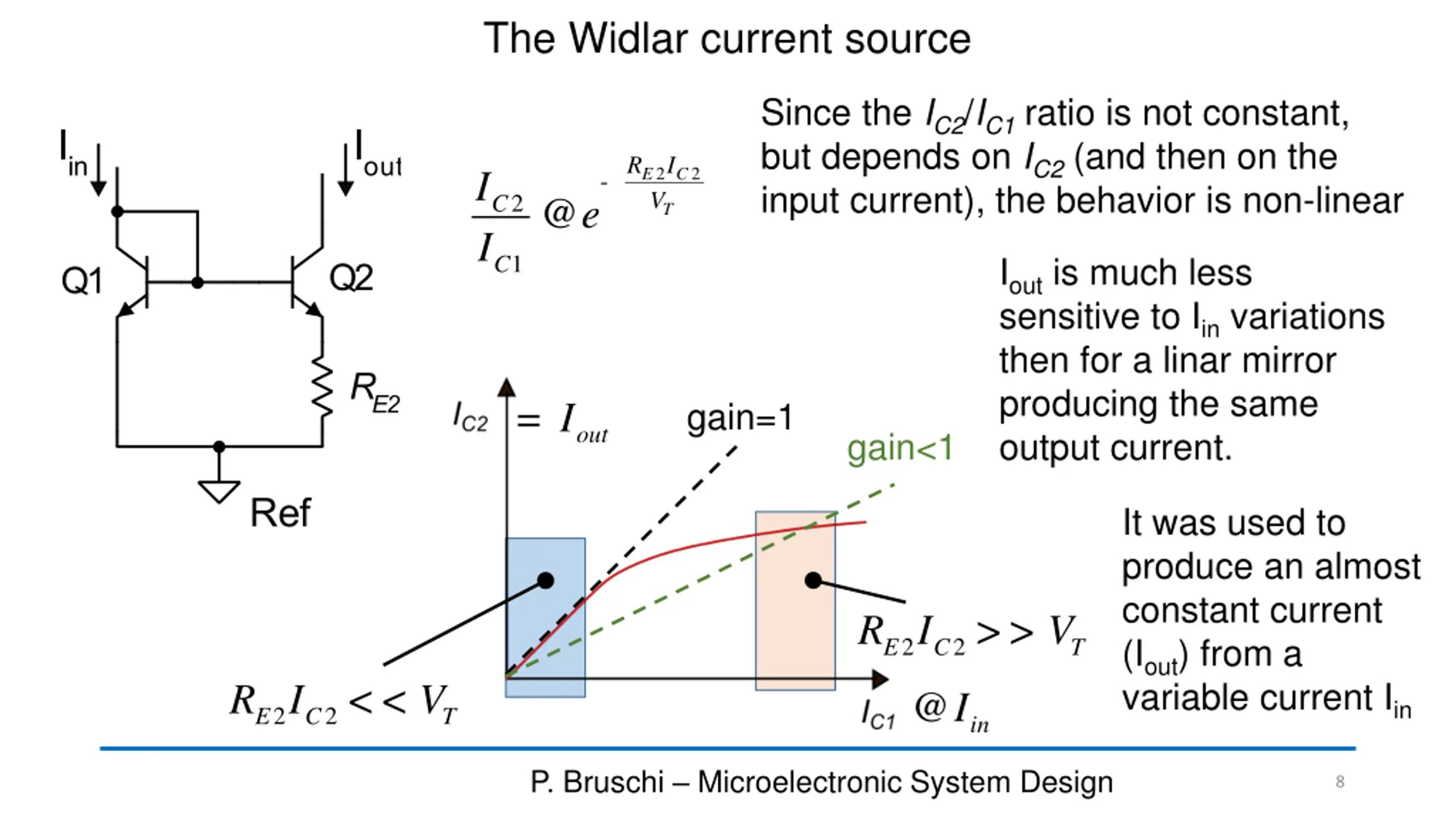The Widlar current source = - V V R I A non-linear current mirror 1 2 2 2 BE BE E E D @ - = @ V V V R I R I 1 2 2 2 2 2 BE BE BE E E E C V V V BE V BE V I I = 1 + @ 2 CB V I I e I e @ ln C V V T T C S S BE T A S I I I I I I I I D @ ln - ln = ln 1 2 1 2 C C C S V V V V BE T T T 1 2 1 2 S S S C R I I I 2 2 E C - I I V @ 2 C e @ R I D @ ln 1 C V V T If Q1=Q2 (IS1=IS2) 2 2 E C BE T 1 C 2 C P. Bruschi Microelectronic System Design 7